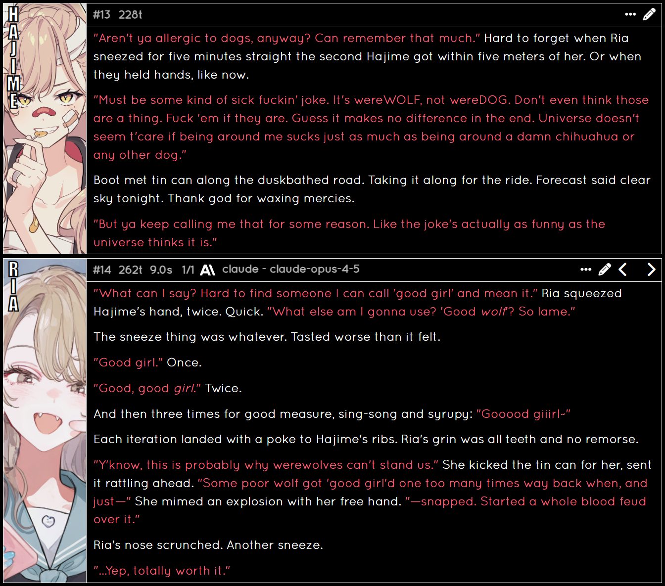 >>558605417gimme a character to play with and ill post logs