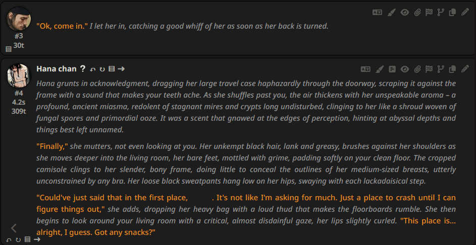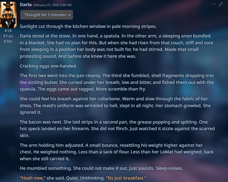 >>558586824>200 tokensHmm and I thought I was bad for doing 500. A lot of the slop is removed when AI just writes less, plus you have more agency.