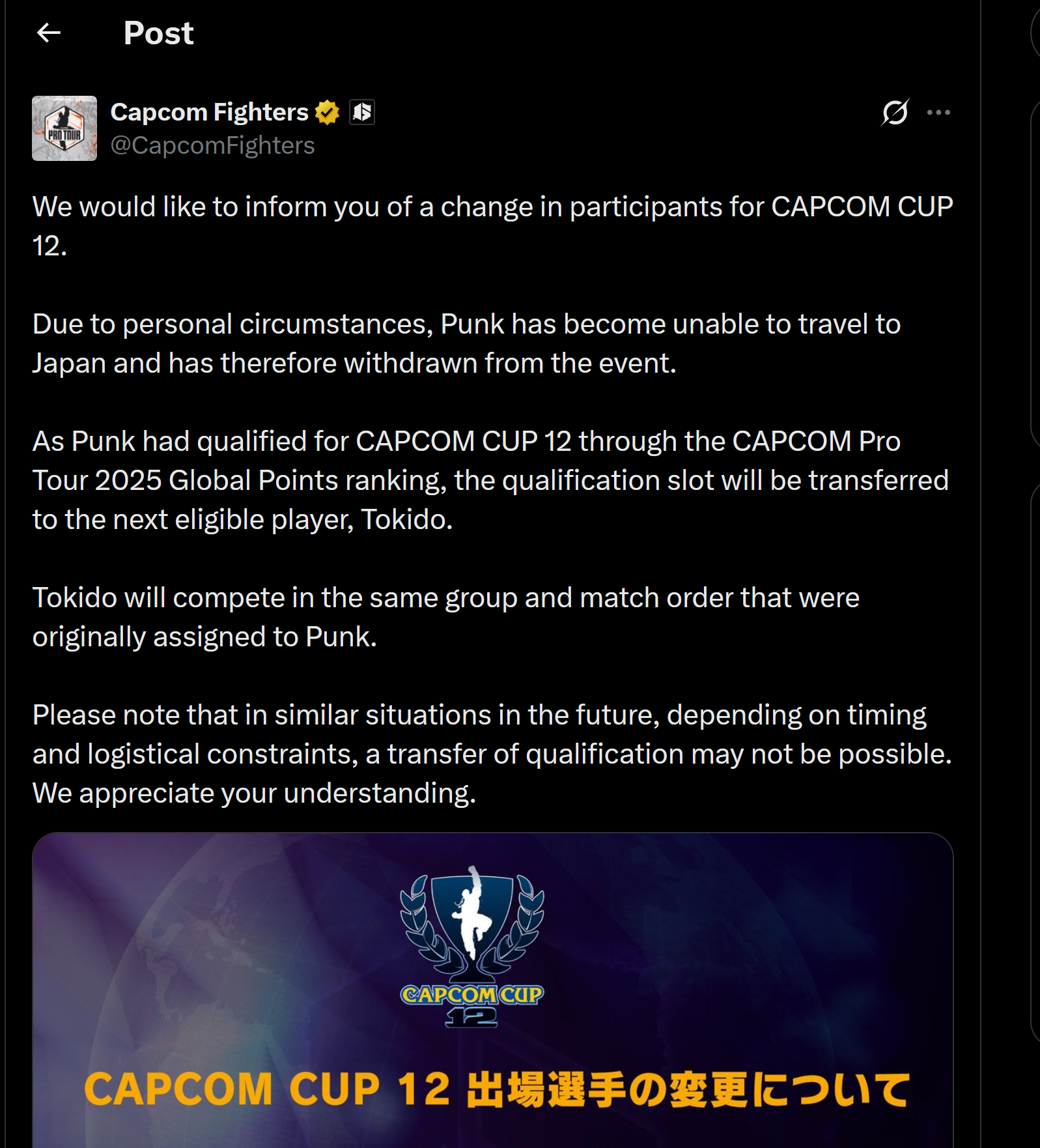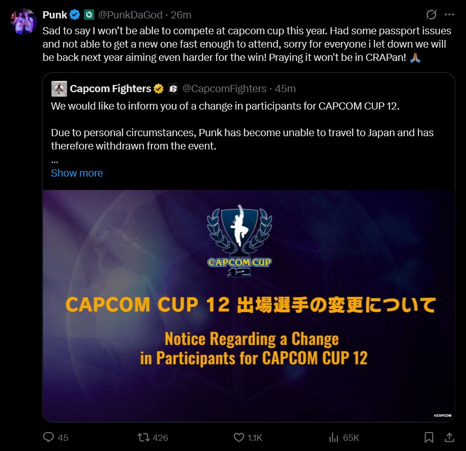 punk can't participate in capcom cup this year because his passport got fucked