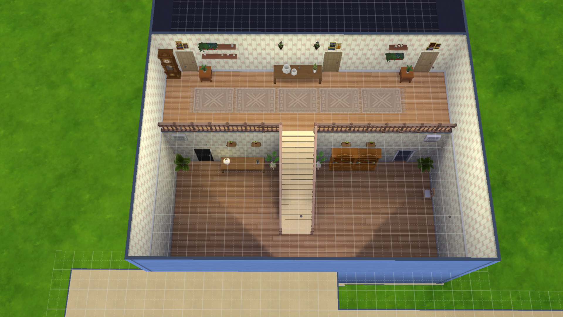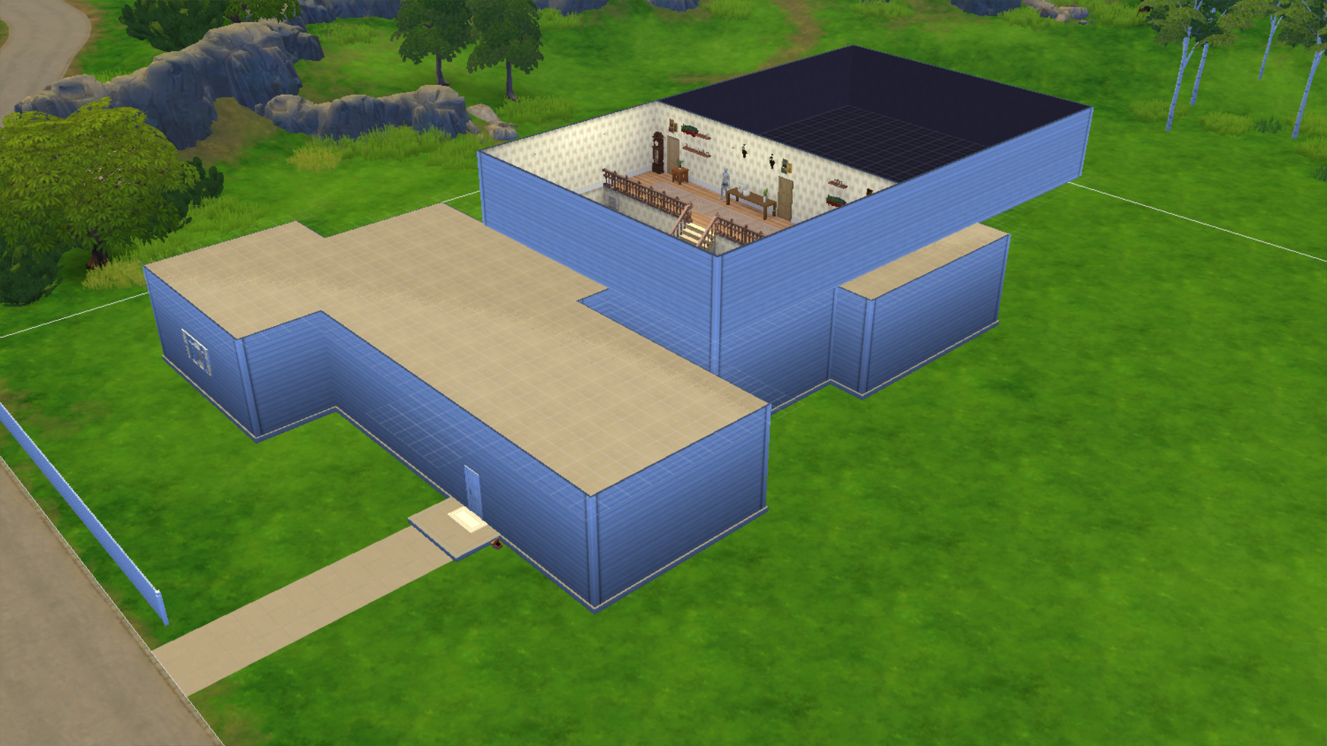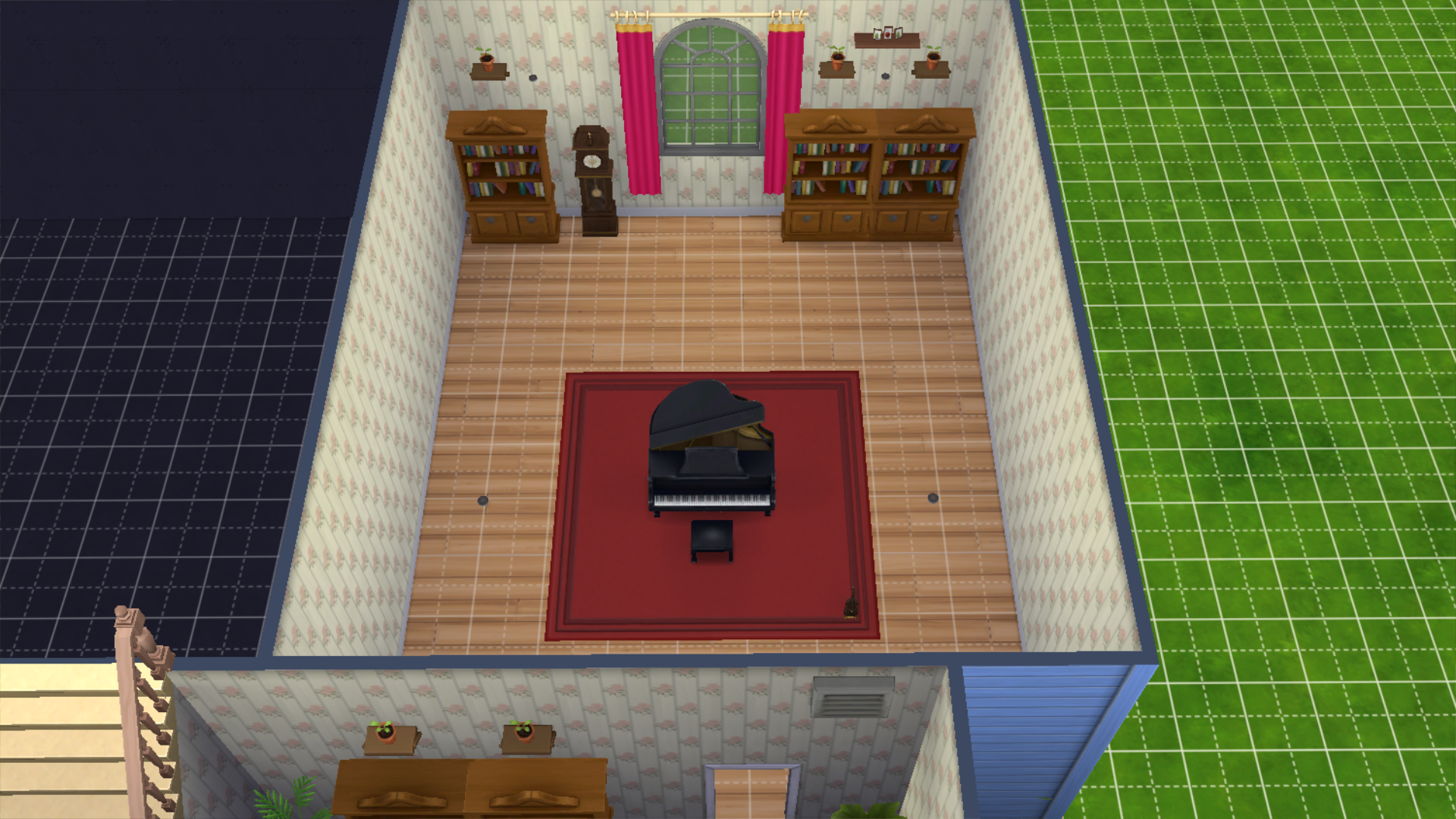 Finished the piano room, obviously to make the window as stupidly massive as it is in game the room would have to be two stories since I already have the walls at the tallest setting, but even if it was, even with the bb.moveobjects cheat if you resize the windows to be bigger the actual hole in the wall they make stays the same so wasn't going to happen either way. Regardless it looks better than I expected, I also put the violin in there so Sunny can play it once I actually get around to playing with the Sims.