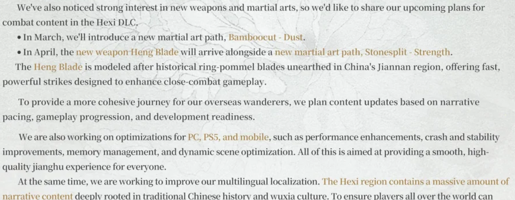 Mo Money Mo Robes EditionPrevious Realm: >>558453410Hexi Trailer:https://www.youtube.com/watch?v=LmvbWN4CZY4 [Embed]February Roadmap:https://x.com/WhereWindsMeet_/status/2017421324109680685Where Winds Meet is an epic Wuxia open-world action-adventure RPG set in ancient China at the tenth century. Players will assume the role of a young sword master as they embark on a journey to uncover the mysteries of their own identity. Let the wind carry your legend on an epic journey to the East!Download Now:PS Store: https://playstation.com/games/where-winds-meet/Steam: https://store.steampowered.com/app/3564740/Where_Winds_Meet/Official PC Launcher: https://wherewindsmeetgame.com/news/official/GlobalLaunch/InstallGuide.htmlWebsite: https://www.wherewindsmeetgame.com/Maps:Chinese: https://map.17173.com/yysls/maps/qingheEnglish (global): https://mapgenie.io/where-winds-meet/maps/worldNeed help figuring out dailies and weeklies?WWM Helper: https://besaids.github.io/WWM-Helper/home/vg/ Guilds:>Name: Sage>ID: 10001992>Region: NA32/100>Name: Heavenly Sage>ID: 10036681>Region: NA76/100>Name: NoFunAllowed>ID: 10149590>Region: EU67/100Search by ID and then send a message to the guild leaders saying you're from /vg/, or put wwmg or vg in your profile so a vice leader can get to you quicker.4chan Group Chat:Social > Friend > Group Chat > Enter the Code 100008774Codes:Settings > Other > Exchange CodeWWM251115WWMDEVTALKYYSLSTIBtf33hxjmjcDEVLOG2601GOOSENEWS