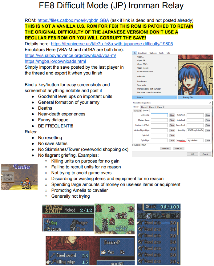 https://files.catbox.moe/kvqbdn.GBAhttps://files.catbox.moe/g7fg8u.sav/vfeg/ Fire emblem 8 ironman relay (its a qol patch so you need this rom). /v/ still hasnt beaten an fe8 ironman without cheating so we need your help. Save us /feg/scholars!