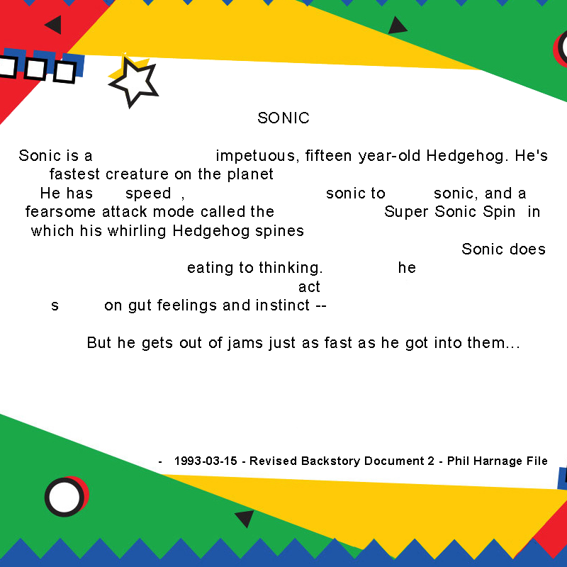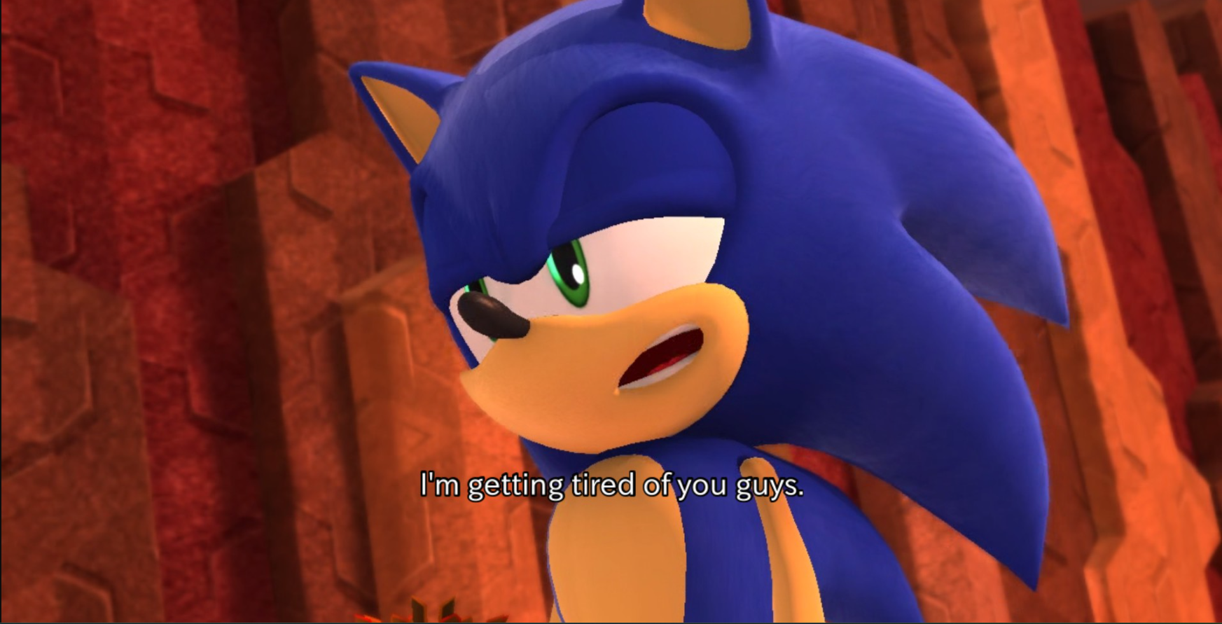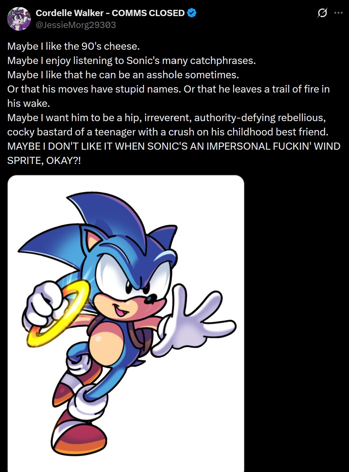 Sonic shouldn't>go into long monologues or speechesTalking too much detracts from the cool factor. Better to let your actions and expressions speak for themselves>crySonic hates tears, a trait that was there since conception>throw a tantrumDetracts from cool factor. Angry look and burst of speed against bad guy's enough. Let the visuals speak for themselves.>be loud as fuck for no reasonThis isn't cool no matter what anyone says. Unless it's for a gag, bro should have indoor voice.>be romanticHim flirting with girls and dating is fine. But he can't be lovey dovey and has to be chill about it.