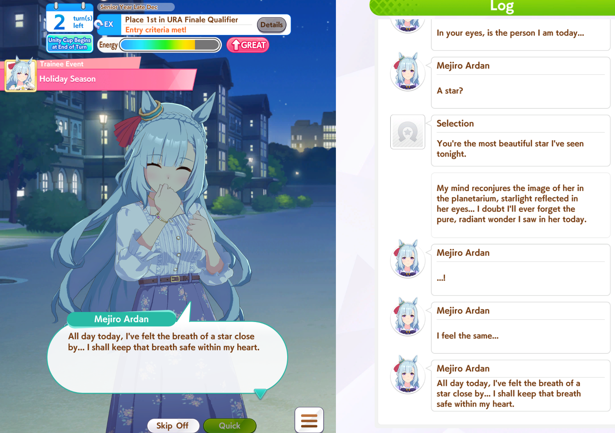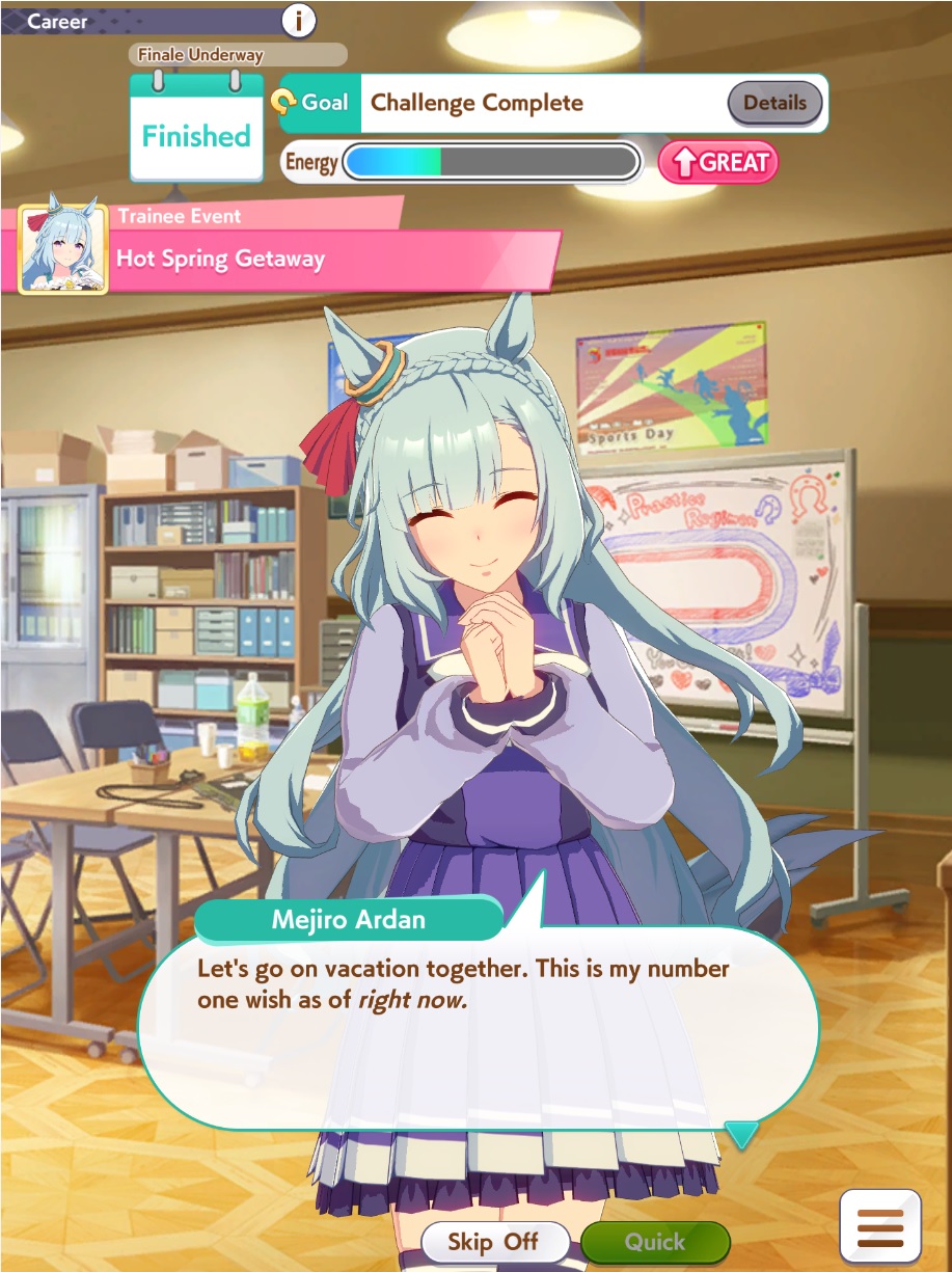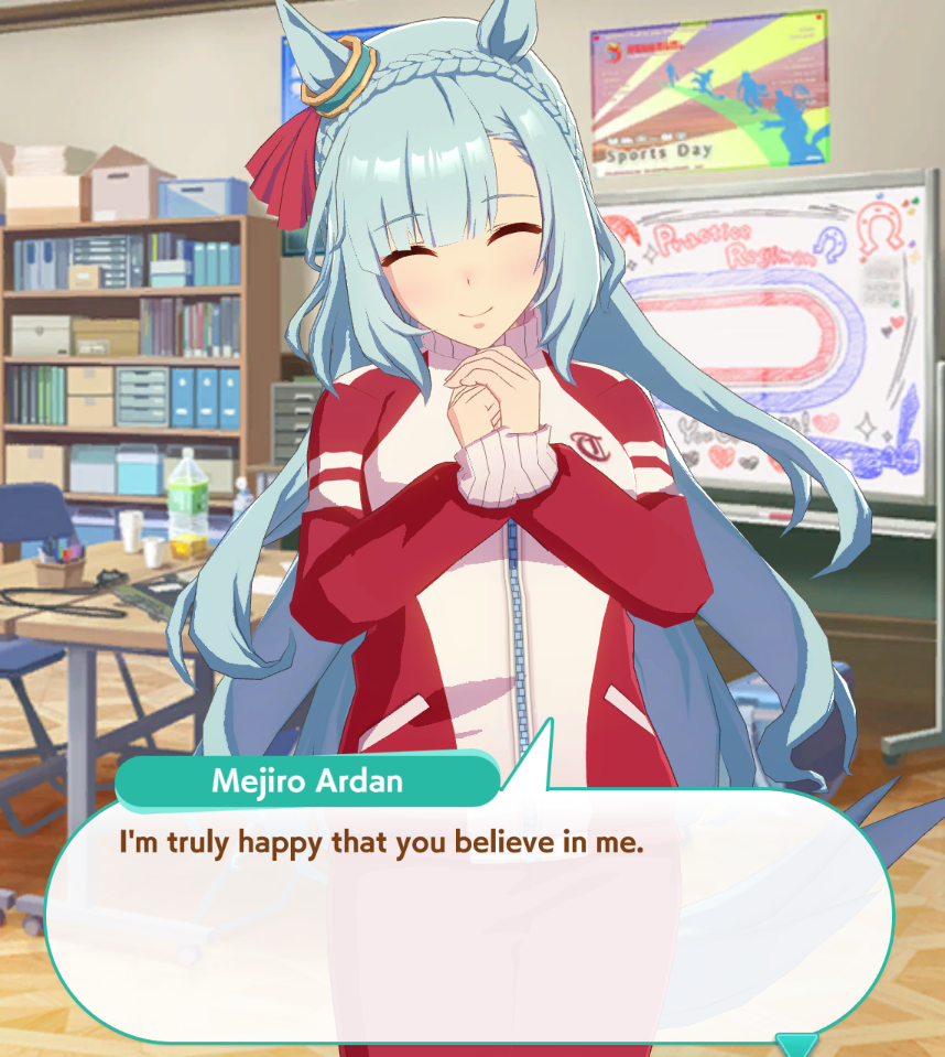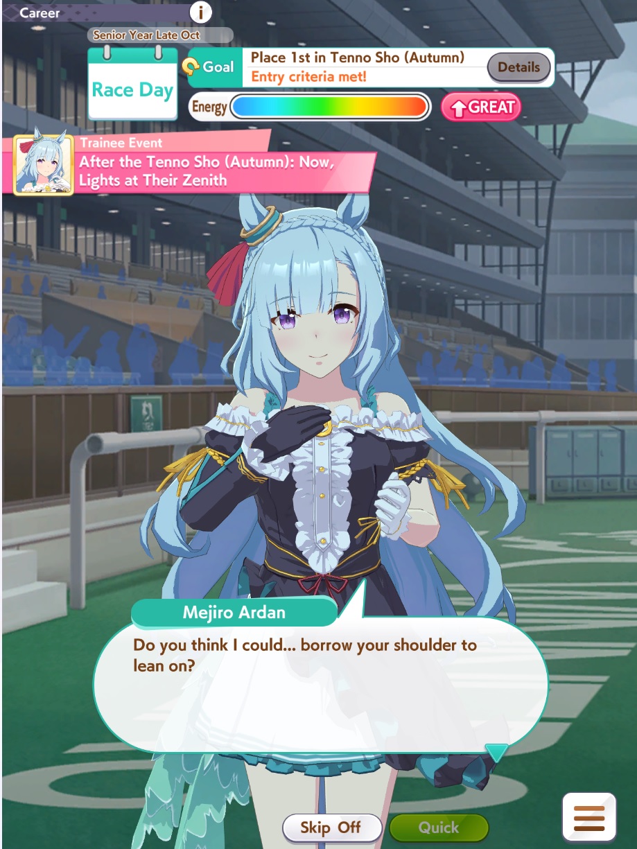 >Actually training my Tachyon properly for the first time after watching the movie>everything is going smoothly, got practice perfect and Charming fairly early>all 1st places>only a coulpe mood drops that are fixed easily>GET THE TICKET>She's using the purple sweater that made me get her prize figureholy shit holy shit>ends a few points from Sah damn it, almost perfect run for what I have