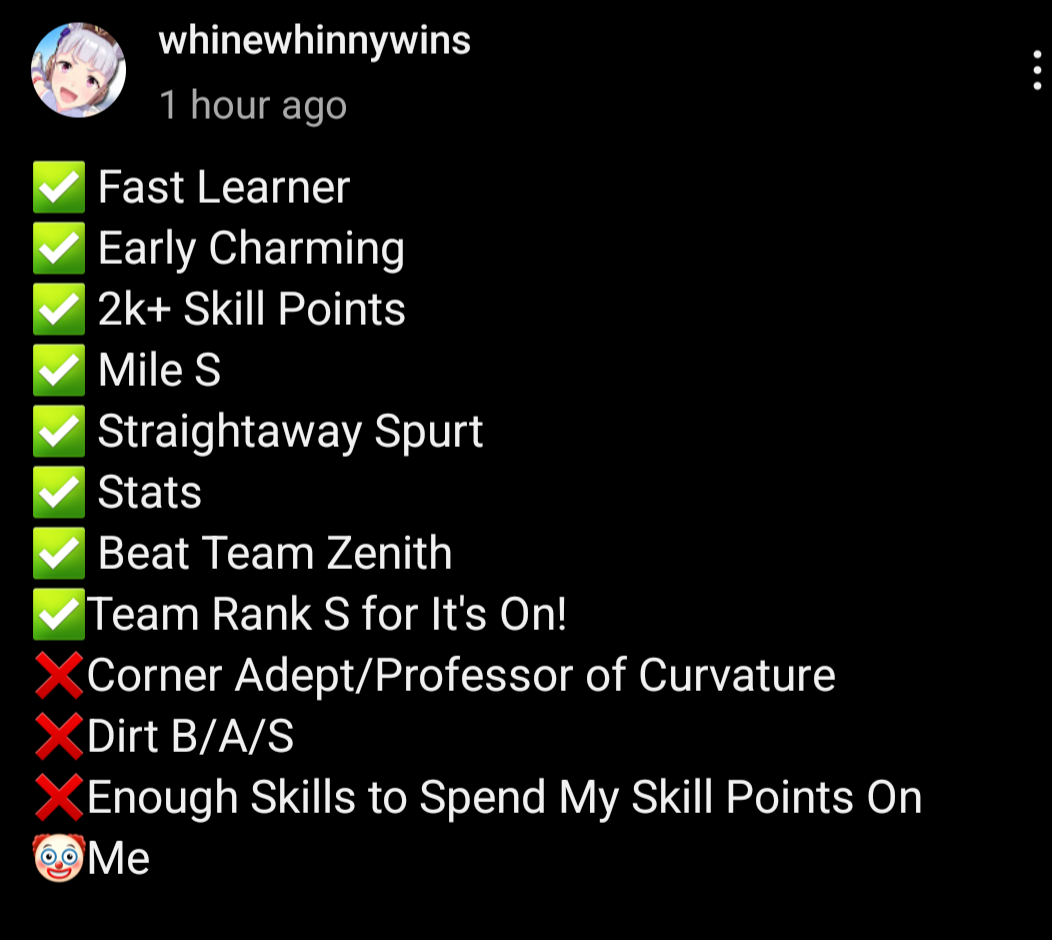 >parent on both sides has 3* dirt>single circle affinity>20 runs>seen dirt spark one single timegoddamn trying to chansform umas is soul killing. im the glue factory's most valuable employee these last couple months.