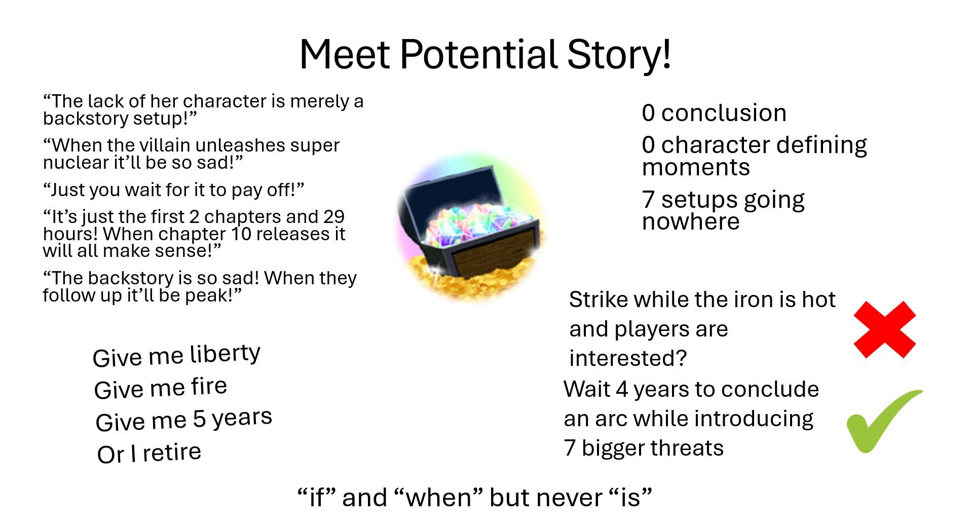 >>558631234they have yet to abandon any plot points, I don't know why anyone ever says "Was X plot point abandoned????"