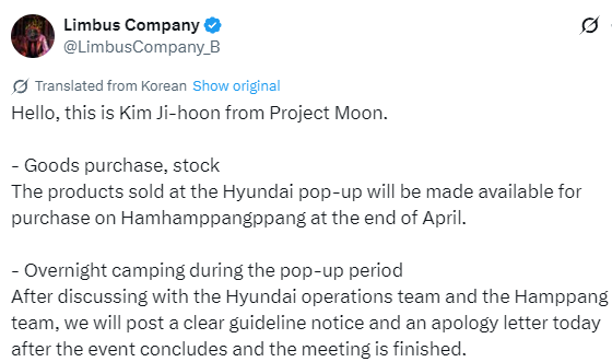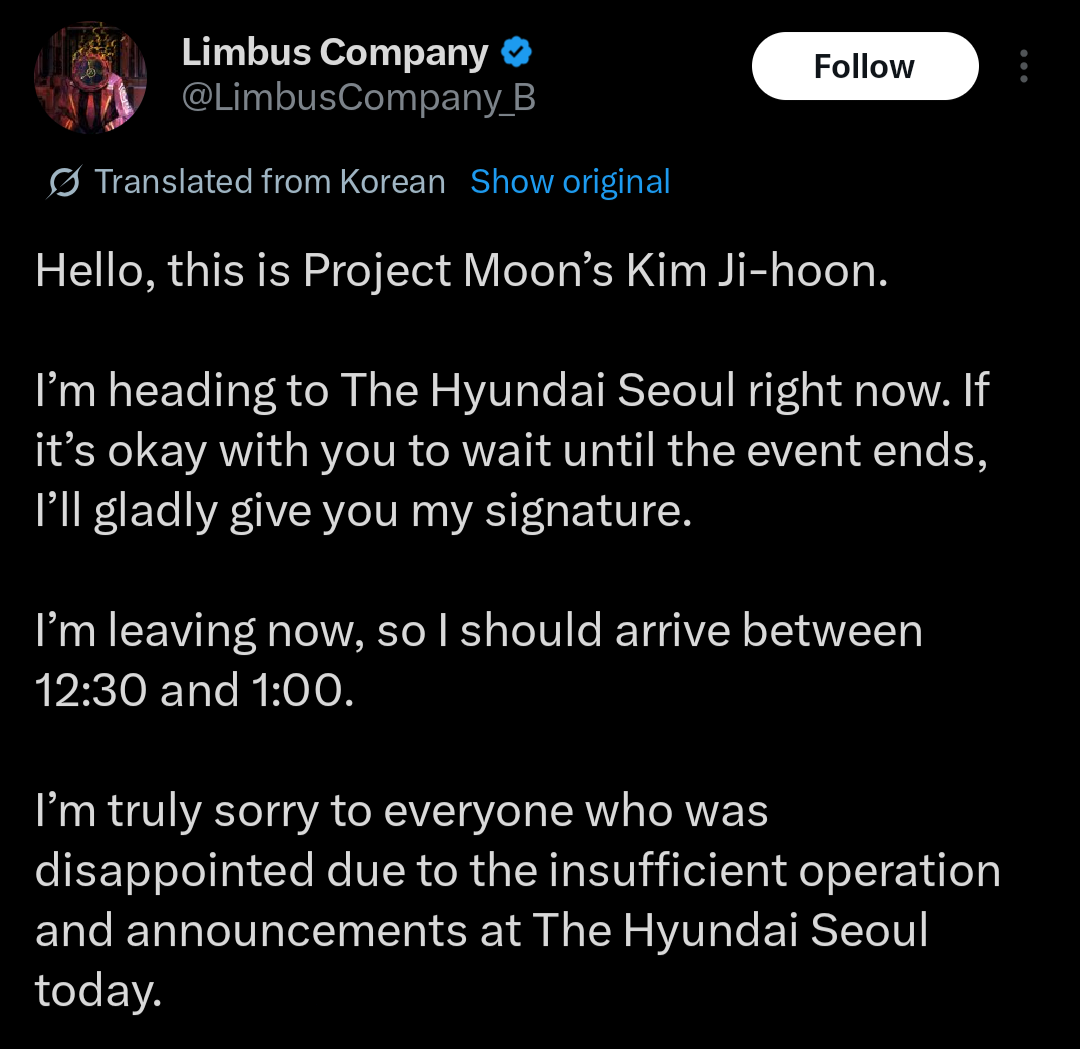 MORE TWEETS FROM THE DIRECTORI'll personally review the situation on-site and consider what to do.The biggest complaints are:- I believed the announcement and arrived on time to wait in line, but for safety reasons, why did you change all the people waiting before to 8 o'clock on-site reservations?- During the pop-up store, there will likely be more people waiting in line all night due to today's incident. Didn't you need another solution?- Why did you make on-site reservations instead of online?- Even if you can't buy merchandise, shouldn't you still be able to participate in the on-site event? Why are you closing the doors right away?We are aware of these issues, and we'll continue to consider them while meeting fans on-site. We'll announce our plan today.We'll make sure to offer autographs to those who aren't waiting in line at the pop-up.https://x.com/LimbusCompany_B/status/2026838181103153180