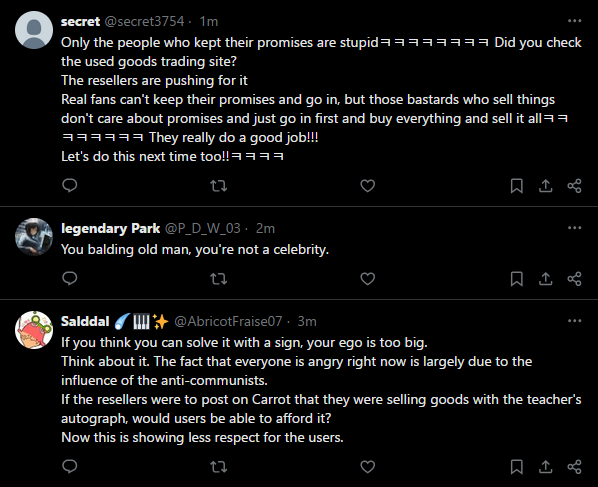 >>558625472>Sorry that we sold all our stuff to scalpers and left nothing to you guys>We'll have more products available at HHPP at the end of April>Also I talked with the pop-up shop staff and we're going to write more guidelines and an apology letterKJH literally got firebombed on the street as soon as he left the car