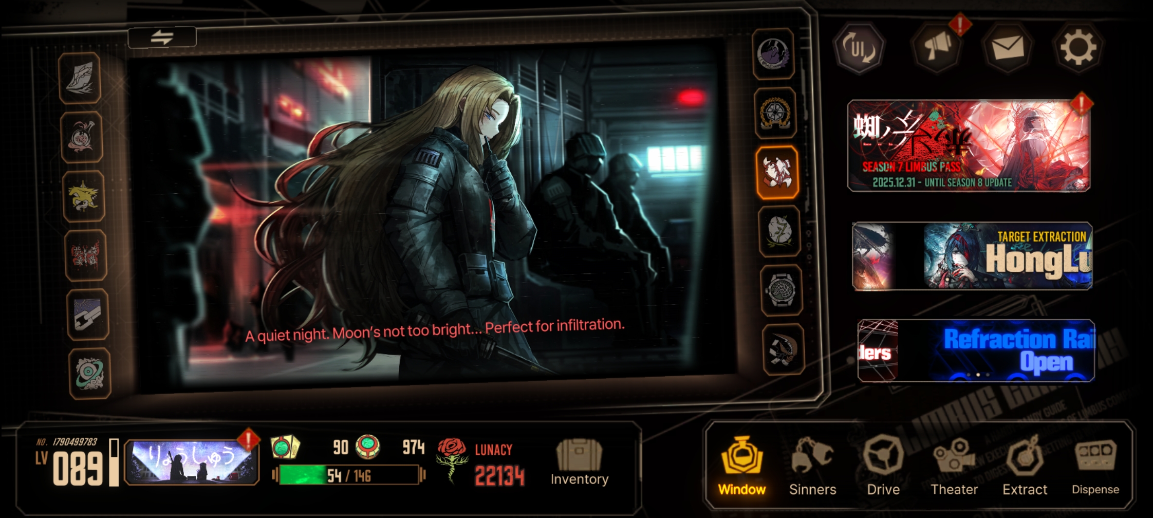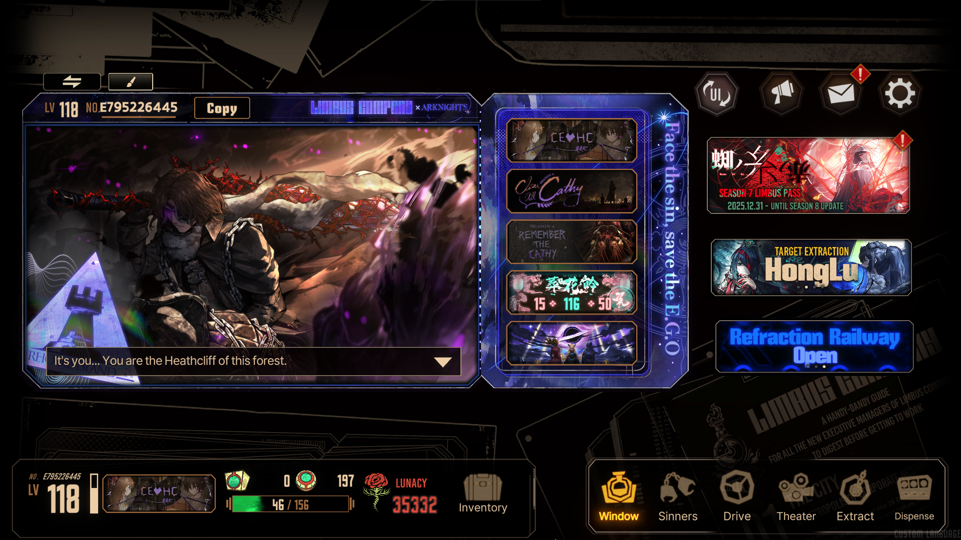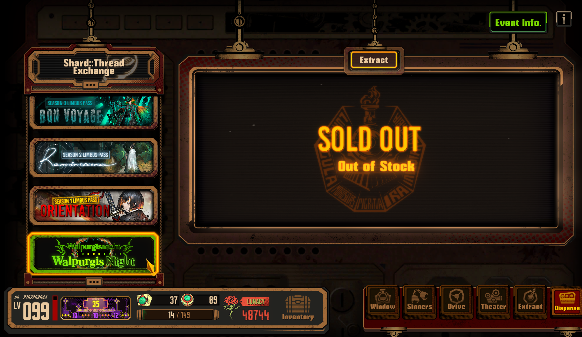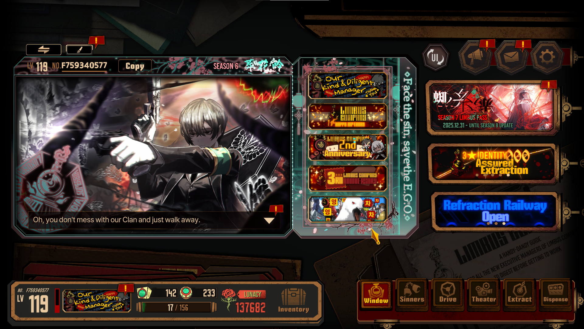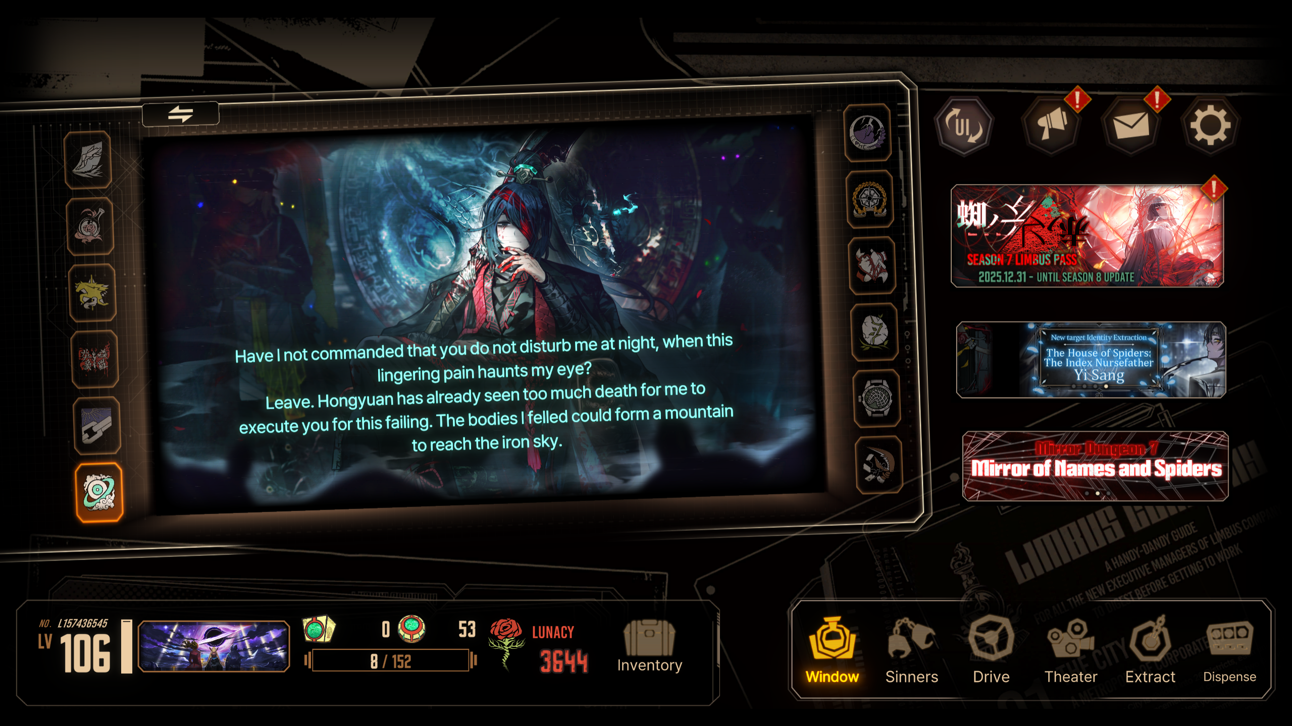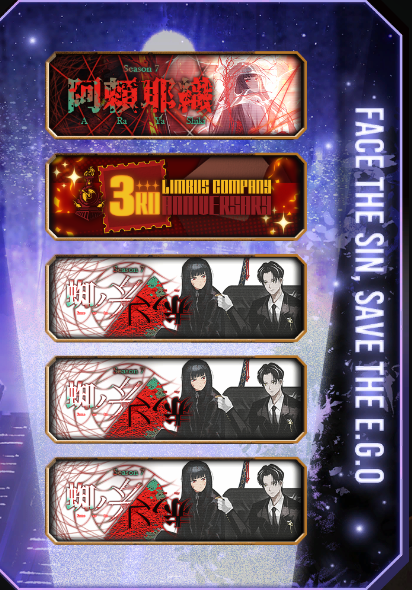 Previous thread: >>558581201Season 7 - Kumo no Ito2025.12.31 — Mirror Dungeon #7 - Mirror of Names and Spiders2026.02.19 —Refraction Railway Line 5 - Merry Go Round2025.02.20 —>Upcoming Events3rd Anniversary Event2026. 2. 26 12:00 — 2026. 3. 26 10:00 (KST)Limbus Company 3rd Anniversary and Future Roadmap Livestream2026.02.27 19:00 (KST)>Upcoming Extractions>Current Extractions2026.02.19 — 2026.03.05[000] The House of Spiders: The Index Nursefather Yi Sang2026.02.19 — 2026.03.05Target Extraction: [Hongyuan] & [Hong Lu]>FAQs! This game is directly tied to the setting of Project Moon's previous games, Lobotomy Corporation and Library of Ruina, and is set after both. Expect spoilers for those games in this thread.! The tutorial is important.>Download linksAppStore: https://apps.apple.com/app/limbus-company/id6444112366Google Play: https://play.google.com/store/apps/details?id=com.ProjectMoon.LimbusCompanySteam: https://store.steampowered.com/app/1973530/Limbus_Company/>Other linksOfficial twitter: https://twitter.com/limbuscompany_bOfficial youtube: https://www.youtube.com/@ProjectMoonOfficialOfficial site: https://limbuscompany.global>Required readinghttps://mega.nz/folder/xosDkZ5Z#Wt4JpUt5Bb2XG77pxuuXpw>For all your EGO and Sinner info needshttps://limbus.kusoge.xyz/https://gll-fun.com/en/>Useful resources and a general guidehttps://rentry.org/lcg_resourceshttps://rentry.org/lcbguidehttps://rentry.org/LCB_optimal_grind_guidehttps://lcb-days-since-last-id.carrd.co/https://lcb-days-since-last-ego.carrd.co/>Countdownhttps://lcbcountdown.carrd.co/