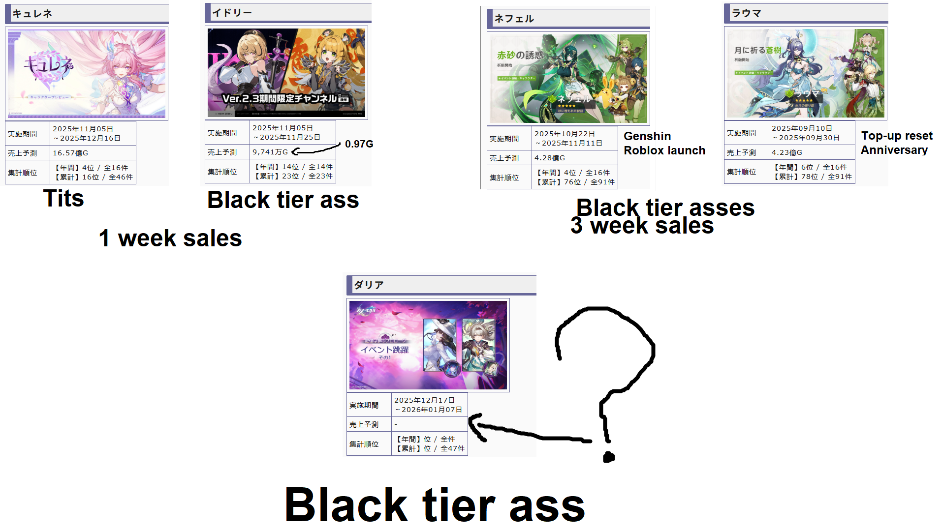 Never forget both dahlia and yao guang flopped because they gave them both black tier asses and their target audience had no money!