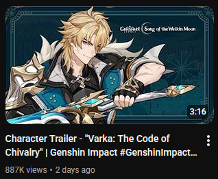 Previous: >>558610136 >Character Trailer - "Varka: The Code of Chivalry"https://youtu.be/_Q-i5CA0ogM (EN)https://youtu.be/NLZad3MENnA (JP) >Character Teaser — "Varka: Where the Knight's Heart Leads"https://youtu.be/fpNygi8Vd0A (EN)https://youtu.be/GAqgp1JMjKo (JP) >"Another Prologue" Animated Shorthttps://youtu.be/4s7G9I4SGZc (EN)https://youtu.be/waZgLGxJN6E (JP) >Version "Luna V" "Homeward, He Who Caught the Wind" Trailerhttps://youtu.be/p02WXZZ84M4 (EN)https://youtu.be/V30u55XoYrE (JP) >Current character banner: Varka, Flins, Sucrose, Xiangling, Bennett>Current weapon banner: Gest of the Mighty Wolf (Claymore), Bloodsoaked Ruins (Polearm)https://www.hoyolab.com/article/43911910 >Daily check-in rewards (permanent)https://webstatic-sea.mihoyo.com/ys/event/signin-sea/index.html?act_id=e202102251931481&lang=en-us >Redeemable Codes with Primogems (all regions): https://genshin.mihoyo.com/en/giftGENSHINGIFT8BHA0KFRG94K8X73KH58KDHNJTSHBHPPKUSVLTT3DVKVLUQZ (NEW) >Useful Links (Wiki, Simulators, Maps, Character Builds, /gig/ friendlist, Third-Party Tools, etc.)https://rentry.org/giglinks /gig/ OP pastebin (use this if making new thread):https://pastebin.com/ca0zseQ9