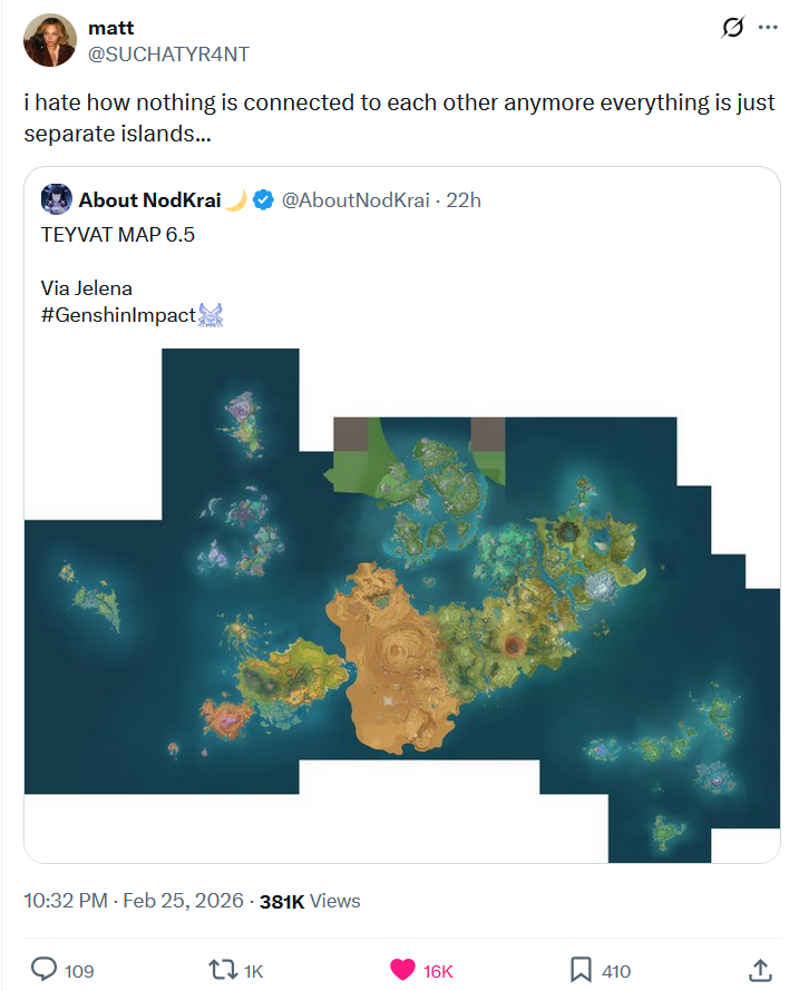 >>558676935It loses its novelty when five of eight regions are comprised of islands, and it also gives Mihoyo the excuse to make the landmasses smaller. Just look at how pitifully small Nod-Krai is compared to the older regions.
