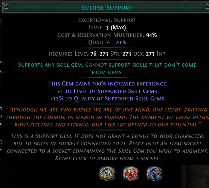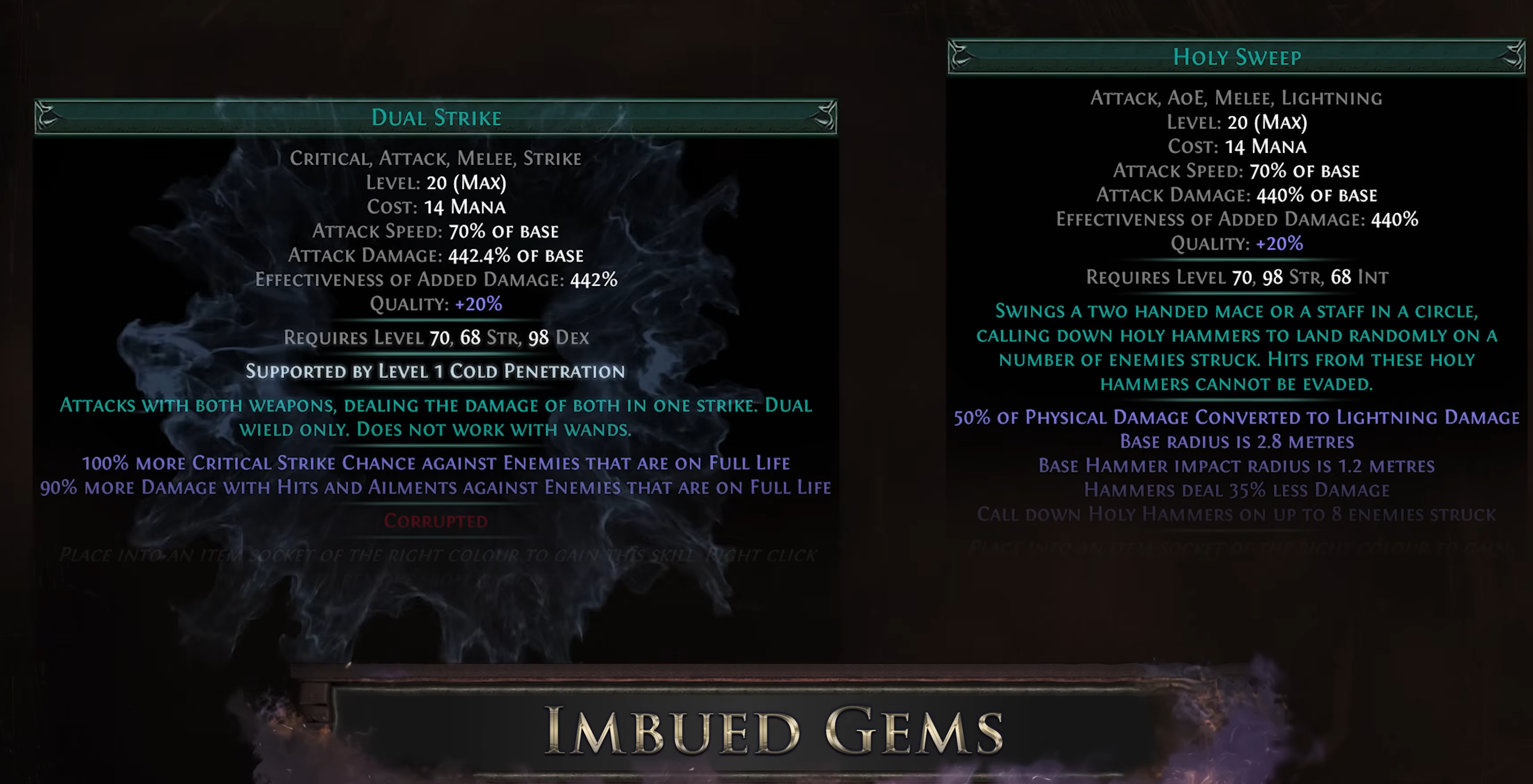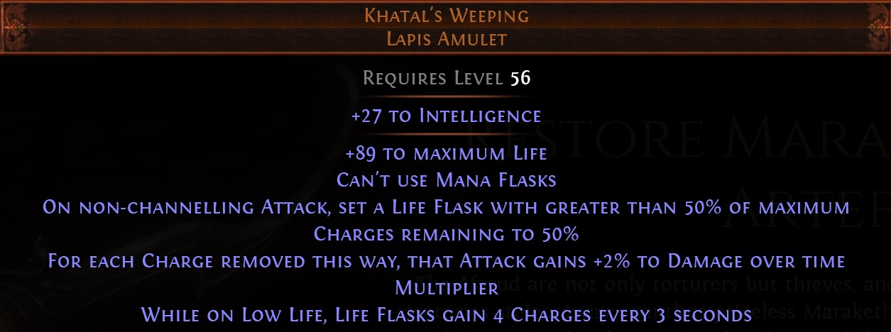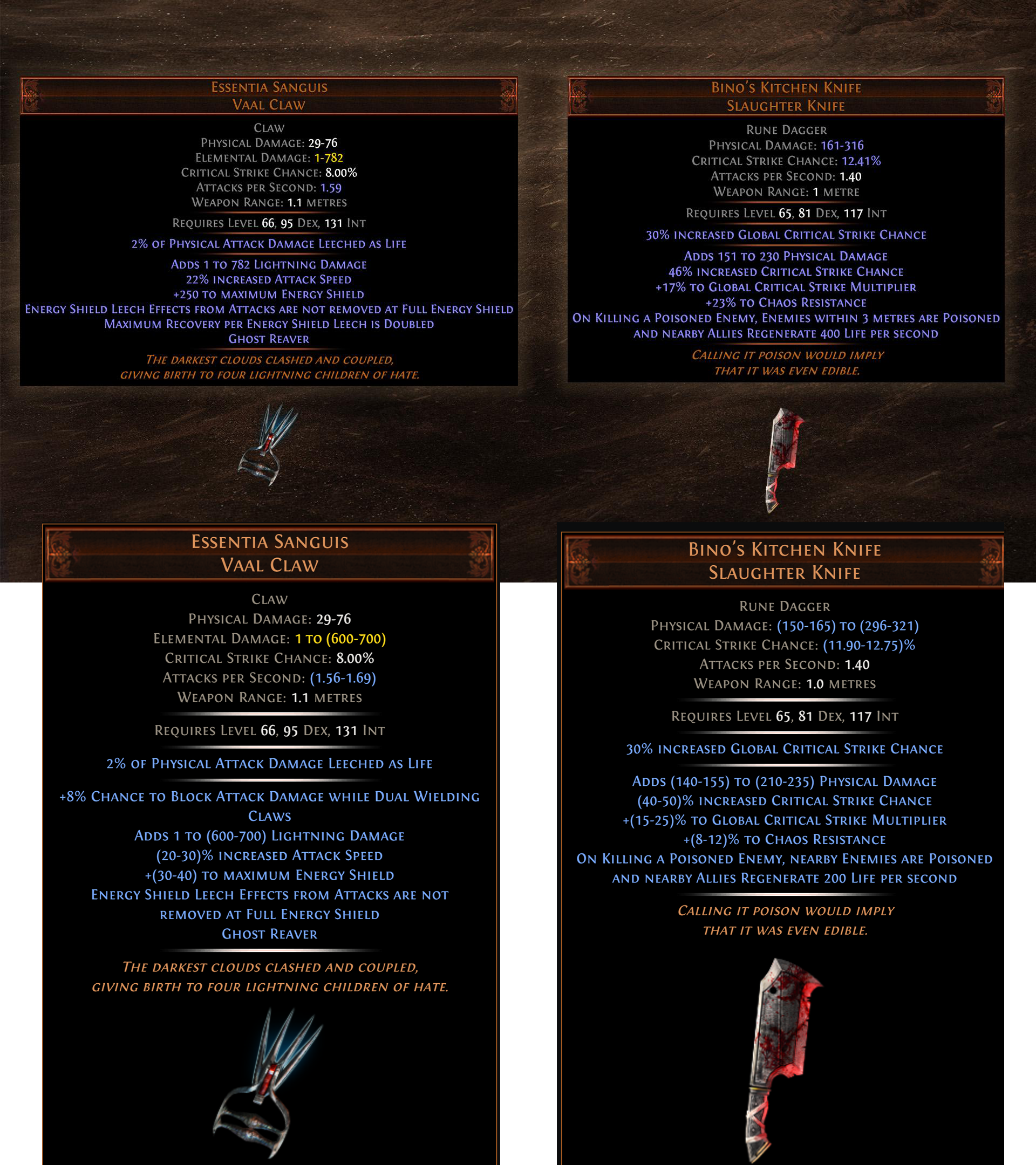 The cope on Essentia Sanguis is...>t-the damage can maybe roll higher>y-you can enchant it to not be so bad>y-you can put it in your offhand and it's only makes your damage 50% less than a 10c claw>j-just get a source of lucky damage>ephemeral edge is being nerfed again so this is actually good>energy blade is being nerfed so this is actually goodIt's unironically over.Double Bino radius is fine but it's still just a clear weapon which nobody needs. DoA patch EoS announced at Exilecon.