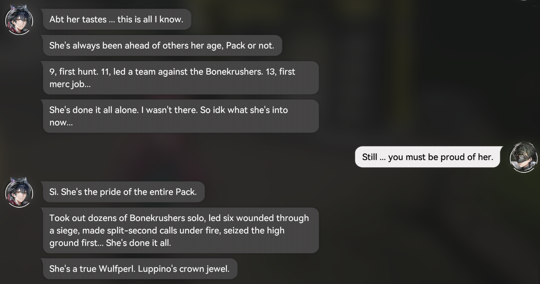 >>558677309No clue, game does everything it can to avoid mentioning specific times for certain events.Maybe we'll know for sure her general age range when her banner drops. We know she's at least above 13, though I don't know how she would memorize Endmin's scent at the age of 3 unless Endmin is a based cradle robber.