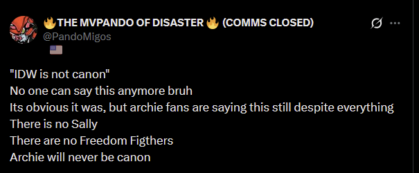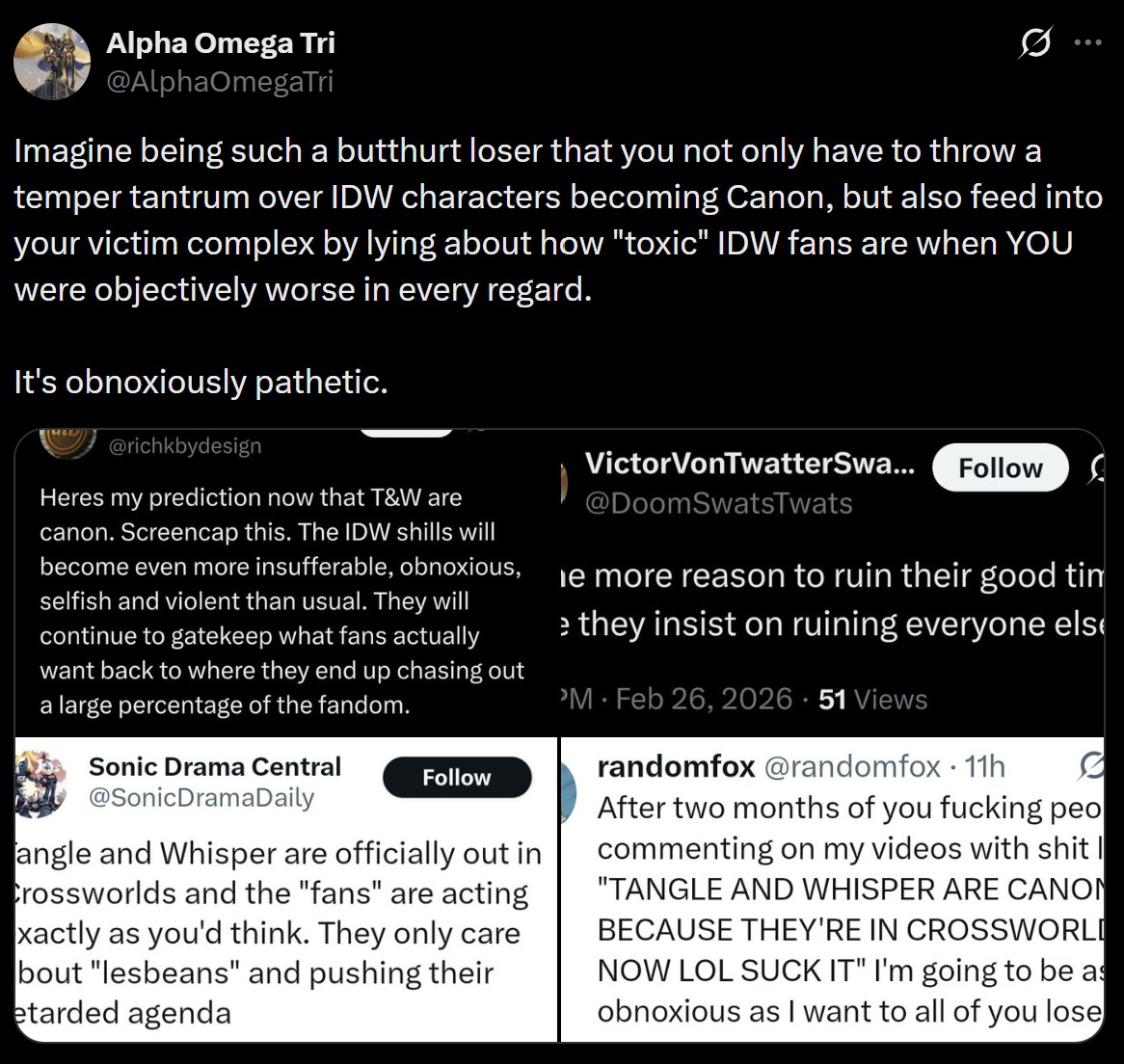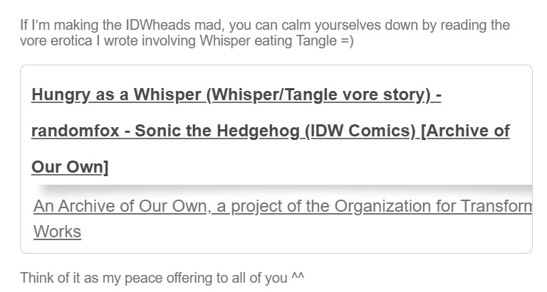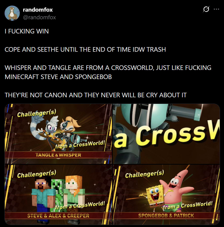Oh Randomfox you poor poor thing. All that hoopla earlier about them being from the crossworlds and for whatOk man. They’re from the crossworlds. We won’t argue that. It’s not changing the fact that they’re going to explicitly reference in comic events for these characters and use their comic backstories and integrate it into canon. Like I said earlier. But hey man they’re from the crossworlds, you won. Enjoy itAnyways the funniest shit to me about that Tailstube is that they doubled down on uwuver fangirling over Whisper lmfao