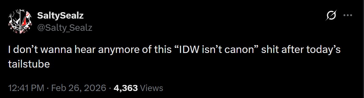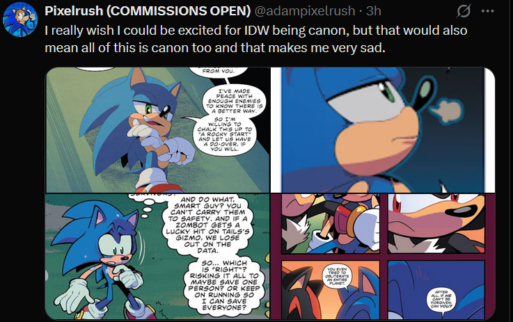 Idw being canon is such an awful decision, and I'm not Randomfox. It's really dampening my love for this franchise after like 15 years of being a fan.It just makes me sad. This isn't what I loved about Sonic.