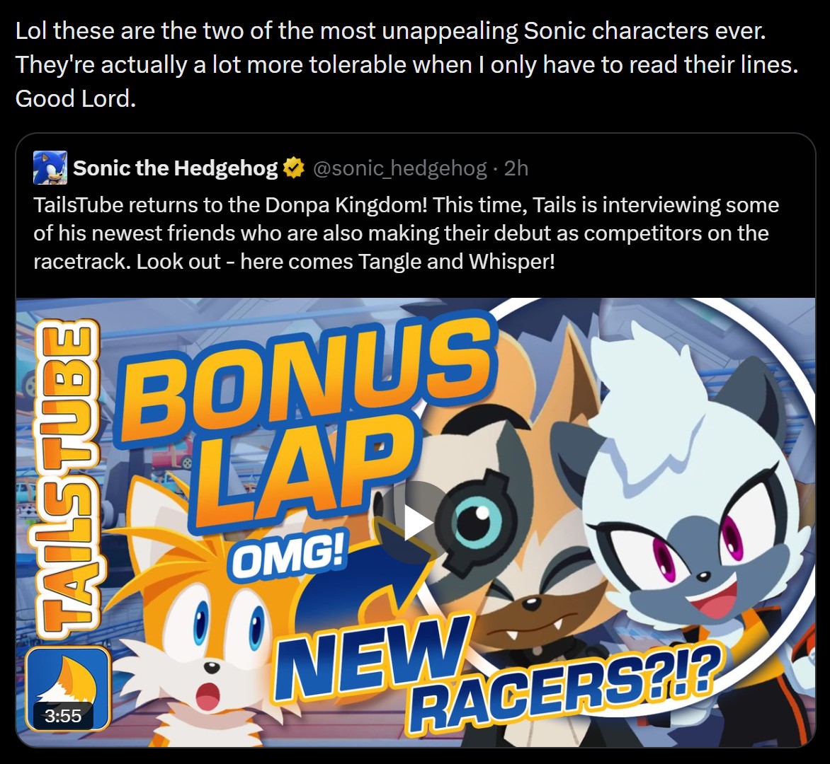 >denialfags: NOOOOO I DOESN'T MATTER IF THE RACING GAMES ARE CANON AND WHISPER AND TANGLE ARE IN, THEY ARE NON-CANON CAMEOS, THEY DON'T EVEN HAVE VOICES>Sega: Okay now the Chaotix files with those two voices reveals are out start recording the new Tailstube video. Make sure to include Belle, Lanolin and all the other comic original characters to fully cement they all are canonFucking kek