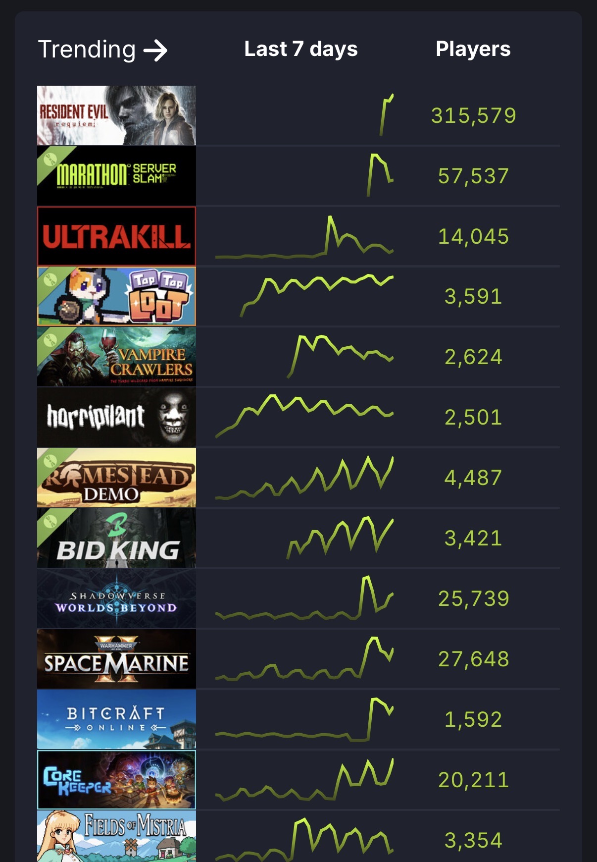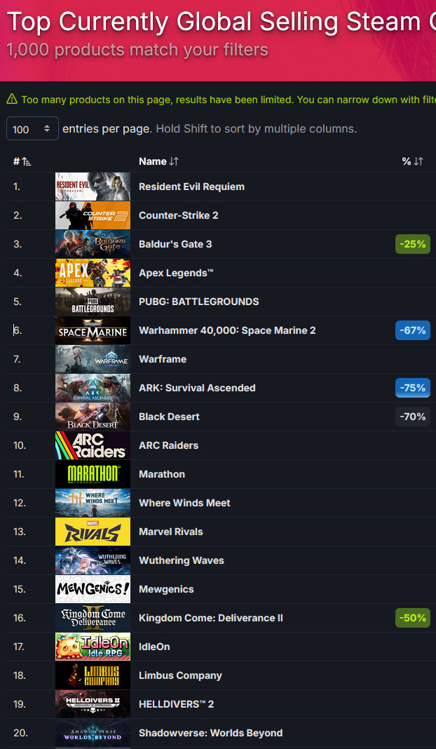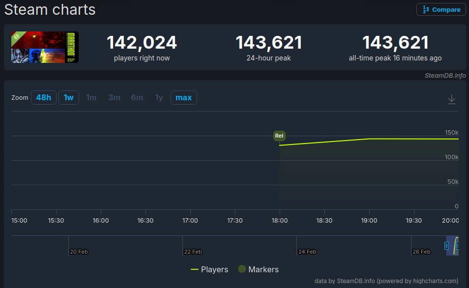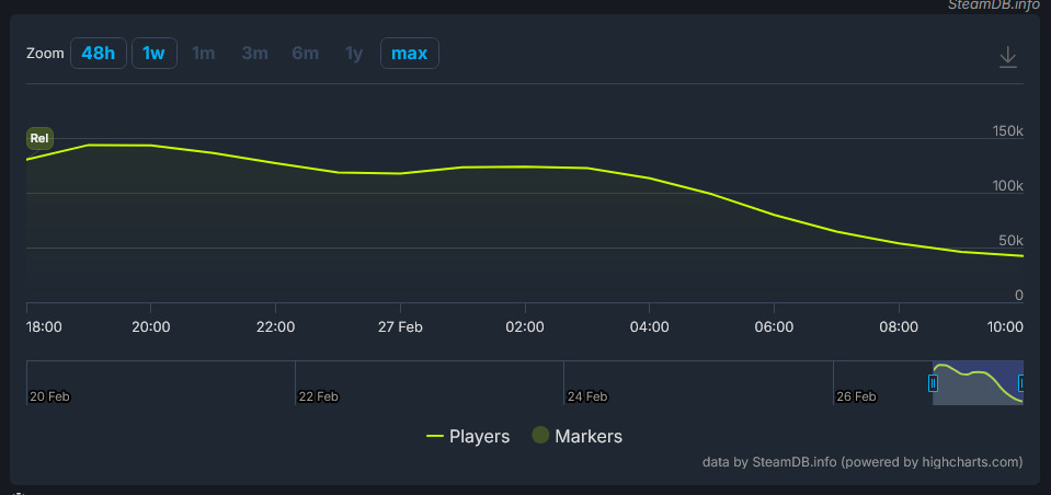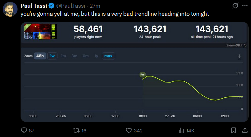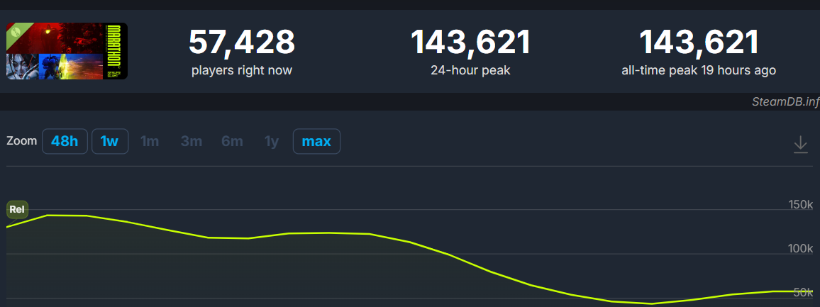 >>558695216First impressions are important, just like with Highguard we're seeing a "crashing headfirst against the wall" effect, people are already getting burned out of the low TTK, Trials-like PvP oriented gameplay and scarce essential loot like ammo and such. The playercount is dropping already and I feel this is the top, not many of these numbers will translate to actual purchases either.