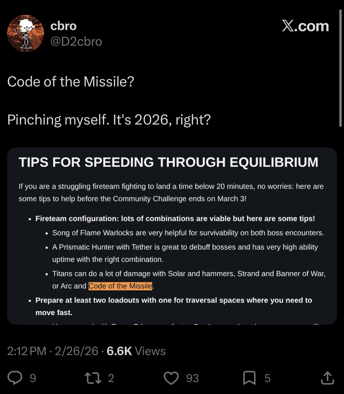 >Guidehttps://www.bungie.net/en/Guide/Destiny2>Year of Prophecyhttps://www.destinythegame.com/en/YearOfProphecy>Destiny Risinghttps://www.playdestinyrising.com/>NewsTWID (2/26): N/AUpdate 9.5.5.3: https://www.bungie.net/7/en/News/Article/destiny_update_9_5_5_3Destiny 2: Renegades launch trailer: https://www.youtube.com/watch?v=PqicEwg2qEc>ResourcesDIM: https://app.destinyitemmanager.com/Armor Picker: https://d2armorpicker.com/API: https://www.light.gg/Stats: https://destinytracker.com/Braytech: https://braytech.org/PressKits: https://press.bungie.com/Destiny-2Gunsmith: https://d2foundry.ggCheckpoint Bots: https://d2checkpoint.com/Popularity Report: https://popularity.report/>TTK, Buffs/Debuffs, DPS, etc...https://docs.google.com/spreadsheets/d/1WaxvbLx7UoSZaBqdFr1u32F2uWVLo-CJunJB4nlGUE4/Previous: >>558418992