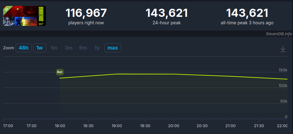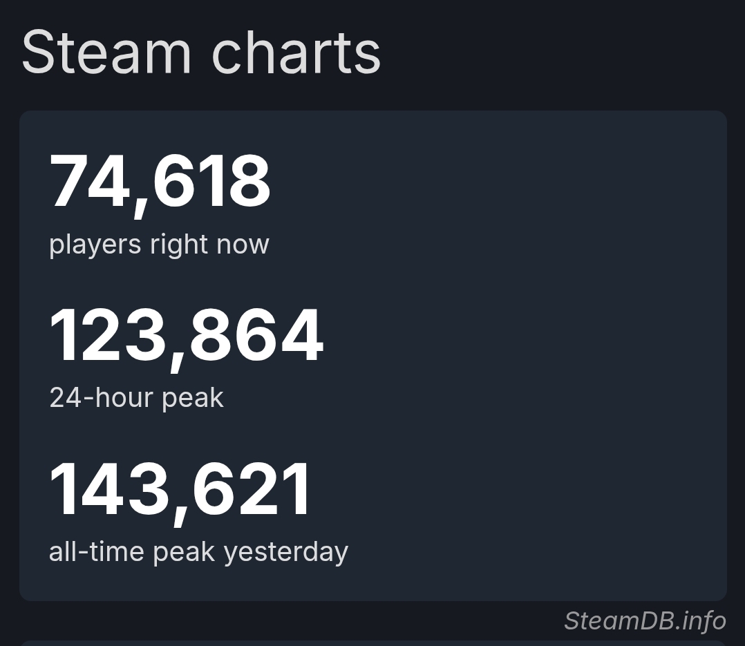 >>558817348The BDF will come at you with excuses about how it’s only 2:40PM PST and how more people are coming back home from work or school, but if it’s anything like yesterday it isn’t going to do much to boost the player population. It’ll probably do 40k during its retail release at best and drop from there.