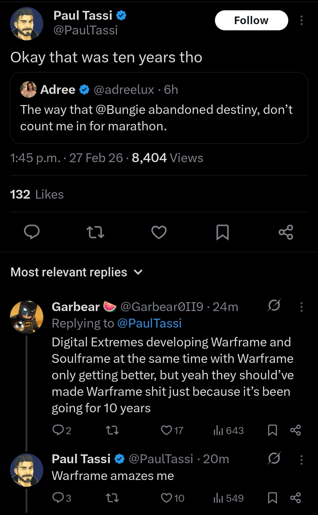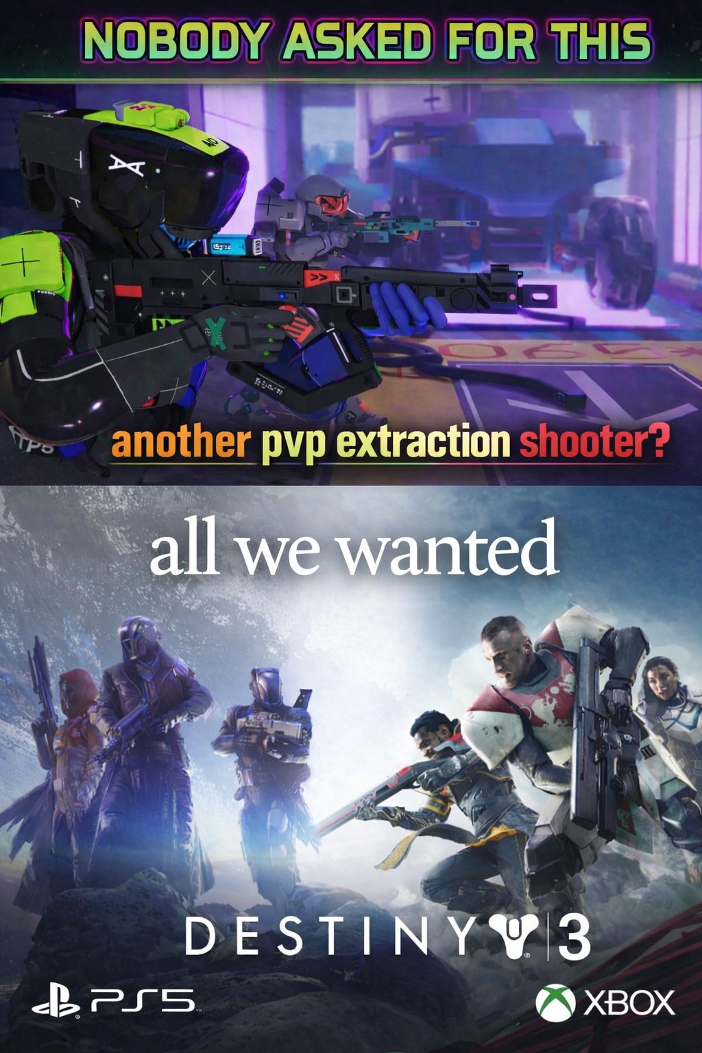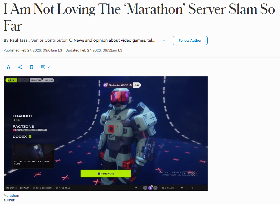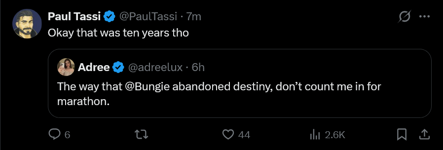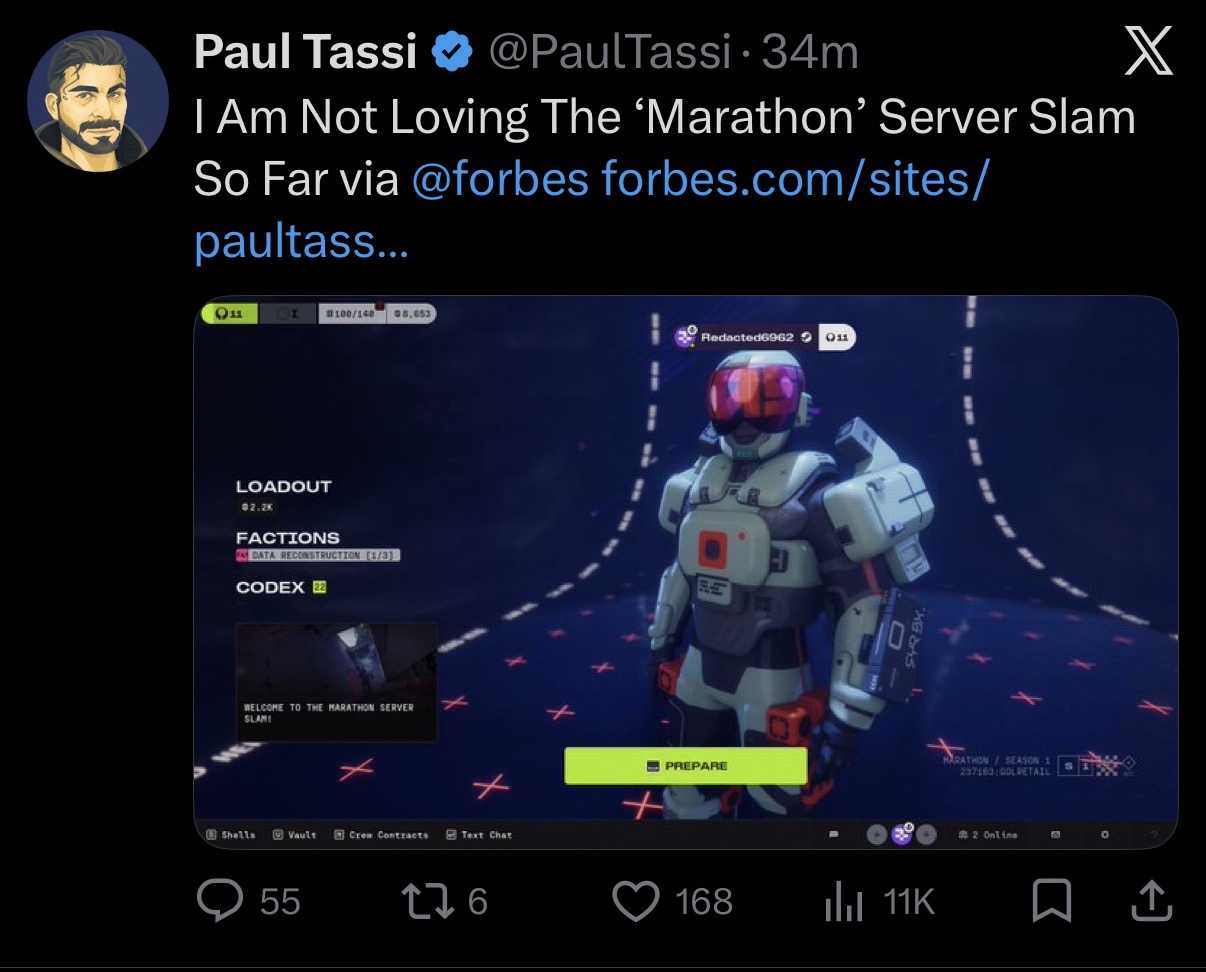 I’m a pretty sizable mark who has Destiny as my brain off game, obviously dipped majorly in concern and care this past year, I was in first and idk the October? Marathon test and even just seeing stuff now and playing a good 6–8 hours between yesterday and today, I mean this is genuinely troubling that it’s on such a delay, money tossed around and this is all they had to show for. Not unplayable but like way too much needs to be overhauled and just not enough time . If the whole chatter of “they need a big title seller status or else” is true, yeah they’re fucked