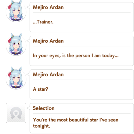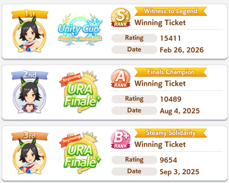 Previous: >>558666064>Global Game NewsLink your account to Cygames iDCurrent Scenario: Aoharu Hai aka "Unity Cup"Current Rate Up Trainee: Mejiro Ardan (3*), Mihono Bourbon (3* alt), Eishin Flash (3* alt)Current Rate Up Support Cards: SSR Agnes Digital (Power), SSR Nishino Flower (Wit), SSR Sakura Bakushin O (Guts), SR Ines Fujin (Wit)Current CM: Aquarius Cup - Tokyo Turf 1600mMain Story Chapter 5 is out02/18 - 03/01 - Valentine Bourbon & Valentine Flash 3*+Nishino SSR+Bakushin SSR02/18 - 03/01 - The Peak of Confection02/25 - 03/05 - Mejiro Ardan 3*+Agnes Digital SSR02/26 - 03/07 - Legend RacesEarly March - Aquarius Cup - Tokyo Dirt 1600m Left-handed / Winter / Sunny / Firmhttps://umamusume.com/news/100040/https://pages.snep.pw/uma/anni-skill-changes/>JP Game NewsCurrent Rate Up: Almond Eye (3*), SSR Forever Young, SSR Casino DriveNew Scenario "Beyond Dreams" releasedTimeline: https://uma.moe/timelineCygames Webstore: https://webstore.cygames.com/en/umamusume_en/>Thread Clubshttps://rentry.co/umaglobalclublistYou must be E3 (20k points) to join a circle. Apply with /uma/ or /vg/ in your profile or post ID in the thread.>All Guides & Resourceshttps://rentry.org/uma26Game databasehttps://gametora.com/umamusume (Click the gear to switch between JP / global server info)A basic guide for newfagshttps://rentry.org/umaglobalFind networks if your region is blocked from the game or clienthttps://www.umavpn.top/93Seiyuu & Concertshttps://rentry.org/umstUmamusume Birthday Calendarhttps://ウマ娘.攻略.tools/events/birthdayUma Texthttps://umareader.idsmile.xyz/