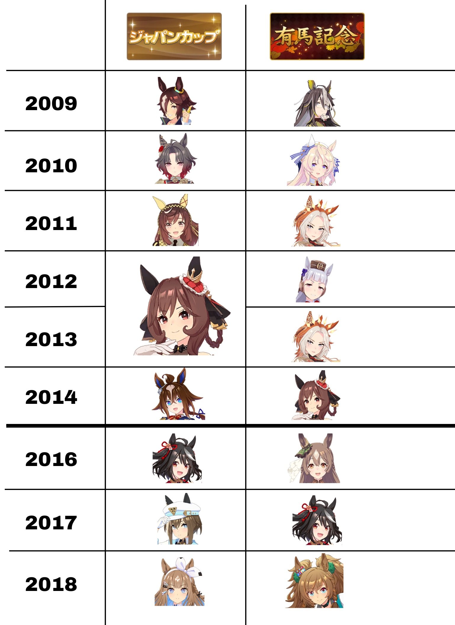 >every japan cup and arima kinen winners are in uma from 2009 to 2018>except for the 2015 onesshonan pandora doko