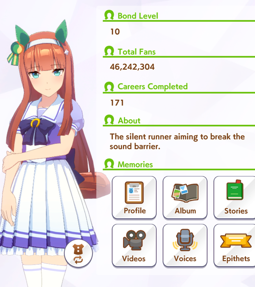 Where can I see the list of songs an Uma has her own vocals for?>>558713810Post her stats?Also check all the various shops. Pretty sure you can buy Derby sashes in one of them. Also, the fact that you don't have infinite Derby sashes tells me that you are a new fag and it's literally not the game, it's you.