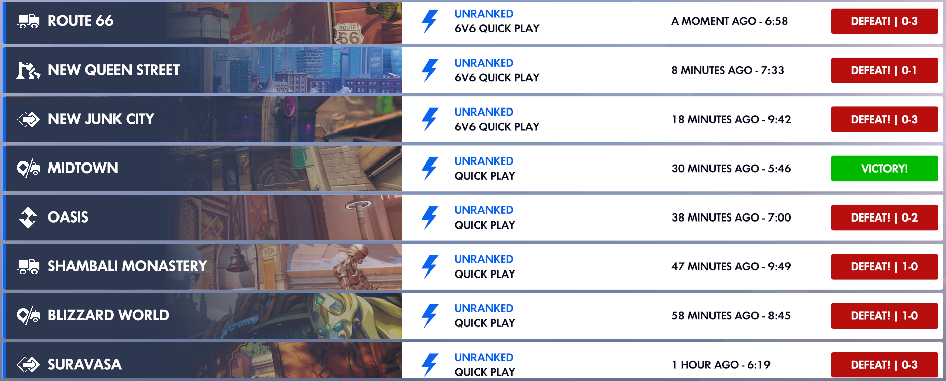 There’s 20 more before this that don’t fit in the screenshot. I’ve been playing since 2016 and never once had games like these. People going 3 rounds with less than 1k dmg/heals. Running into the point and just standing there. I’m pretty sure I somehow got into a bot queue. In the 6v6 it was all the same people too, playing the exact same way. Just running to the point and dying. Crazy shit. Considering uninstalling for a bit.