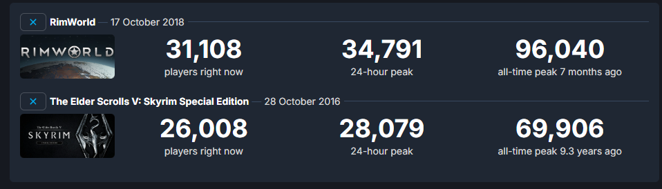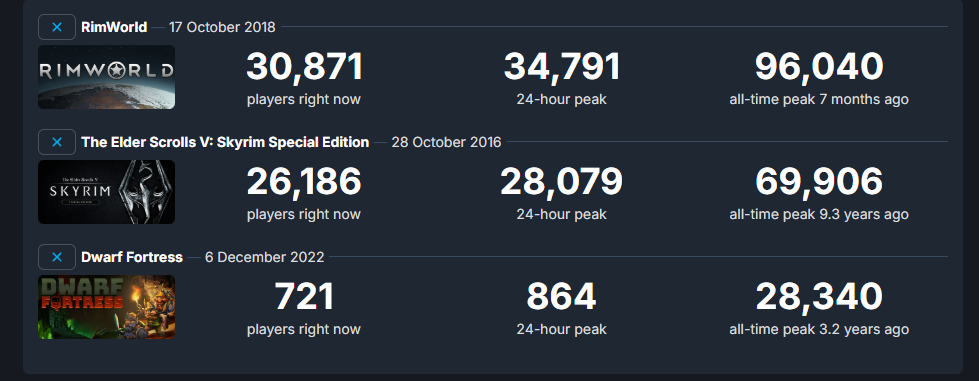 >>558793126>a niche autism project that was known to filter illiterates and graphicsfags, and has been free on the dev's actual site for two decades, has a minute amount of players on steam.>acting as if he has the high ground over skyrim, even when rimworld's most popular mods are actual smut mods, which the briefest glance at its reddit or /rwg/ could tell you>steam charts actually mattering in generalSay it isn't so. Now run along back to /v/.