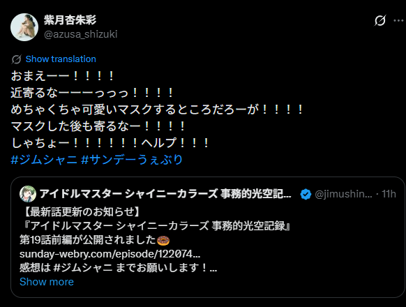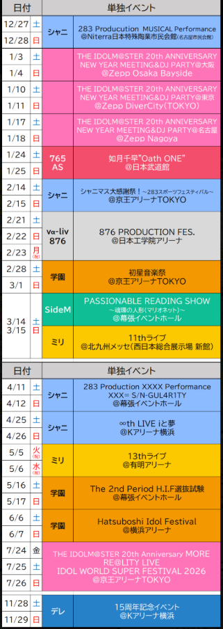 iM@S NEWS ARCHIVE>Gakuen- GK Hatsuboshi Cultural Festival photos (Feb 27th): >>558730148 >>558730318 >>558739720 >>558743554- GK POP UP SHOP at Isetan Tachikawa photos (Feb 27th): >>558745652>Shiny Colors- SC Houkago Climax Girls x Duel Masters Play's collab MV: >>558768556- SC 4koma 608 raw: >>558749858- SC 8th LIVE "iと夢" Cast Update (Feb 27th): >>558732449- SC 8th LIVE "iと夢" flowerstands and gifts details: >>558732830- SC 283PRODUCTION SHOP 2026 #KAWAIIしーずん Nichika illustration (Feb 27th): >>558732968- SC Healed/Mindbroken Luca: >>558755008- Jimuteki Shinography chapter 19 (part 1) raw: >>558731612 >>558778365 >>558778557>Cinderella Girls- CG x NASU-Ways collab campaign "#deremaas@NASU-Ways" from Mar 4th to Mar 29th: >>558738048>SideM- SM Scratch Vol.5 on DMM Scratch from Mar 13th to Apr 13th: >>558755962- SM PASSIONABLE READING SHOW ~Konkan no Marionette~ theme song "Anima Fortuna" preview: >>558769995>Other- An English summary of a Chinese summary of iM@S (part 2): >>558763819 >>558763905 >>558763984 >>558764045 >>558764134 >>558764204 >>558764280 >>558764432 >>558765010- /@/ Draws P-Love 2026: >>558741063