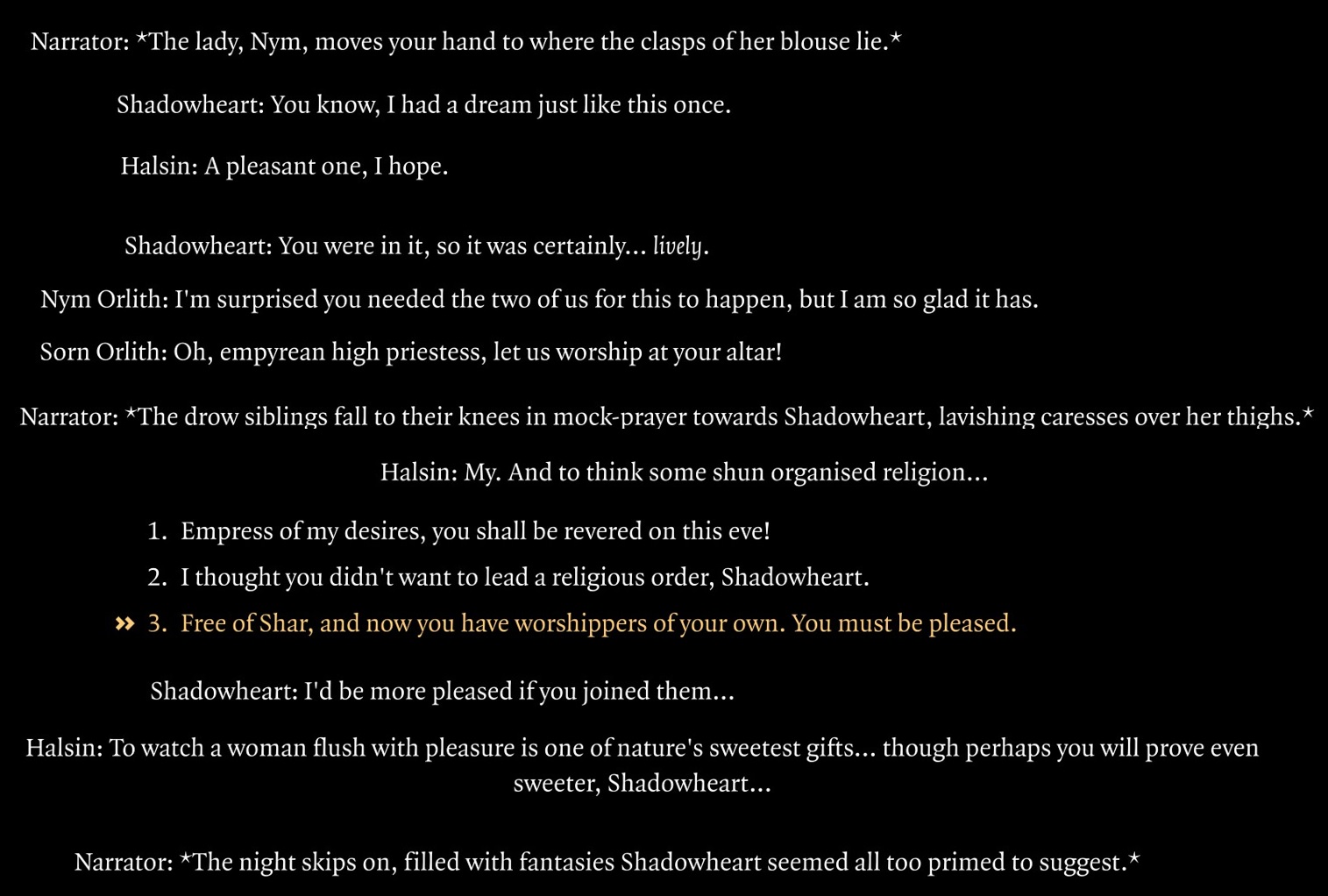 >>558901768imagine losing your mind over this you guys are lucky larian didn't have time to write the rest of the poly romances