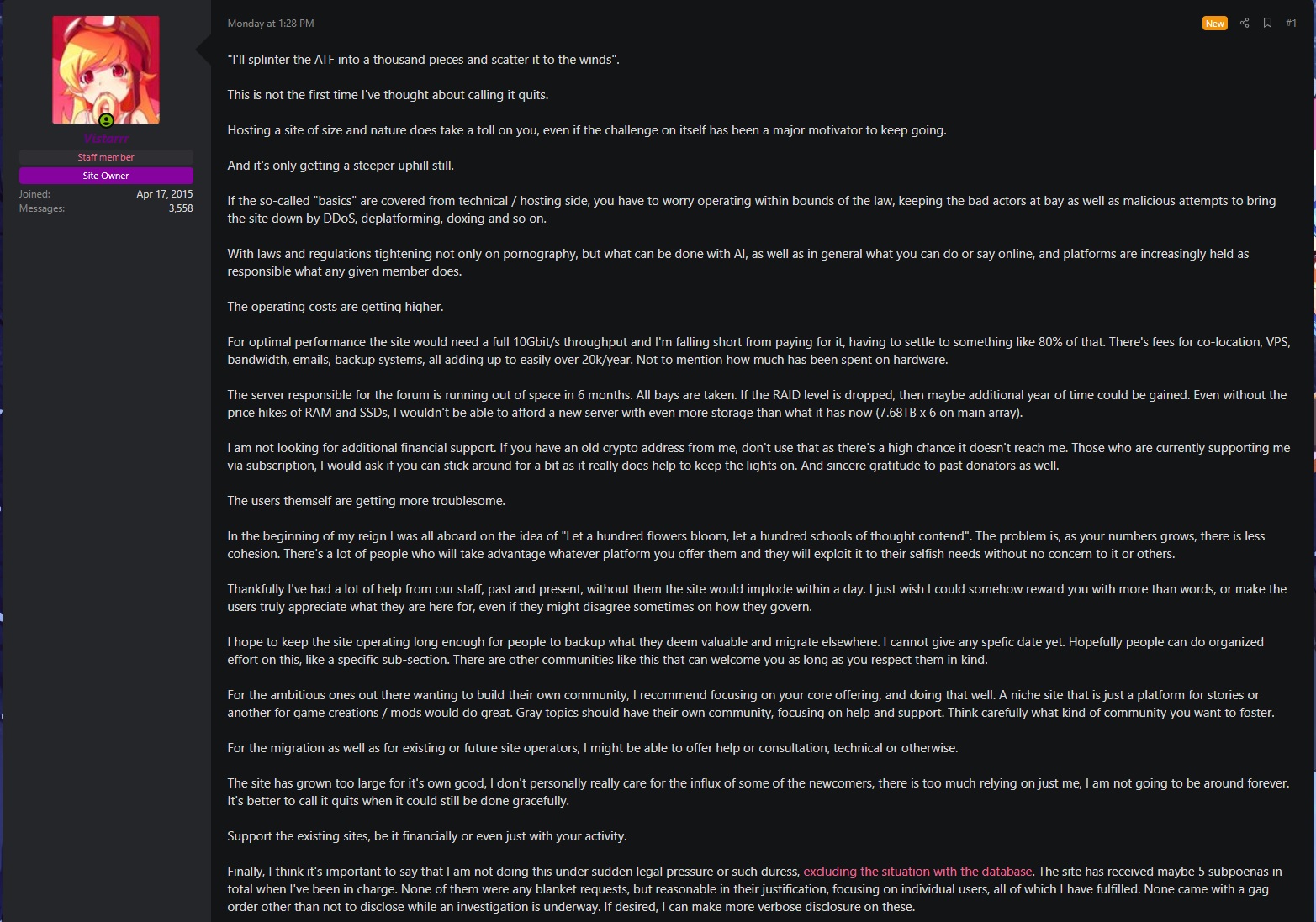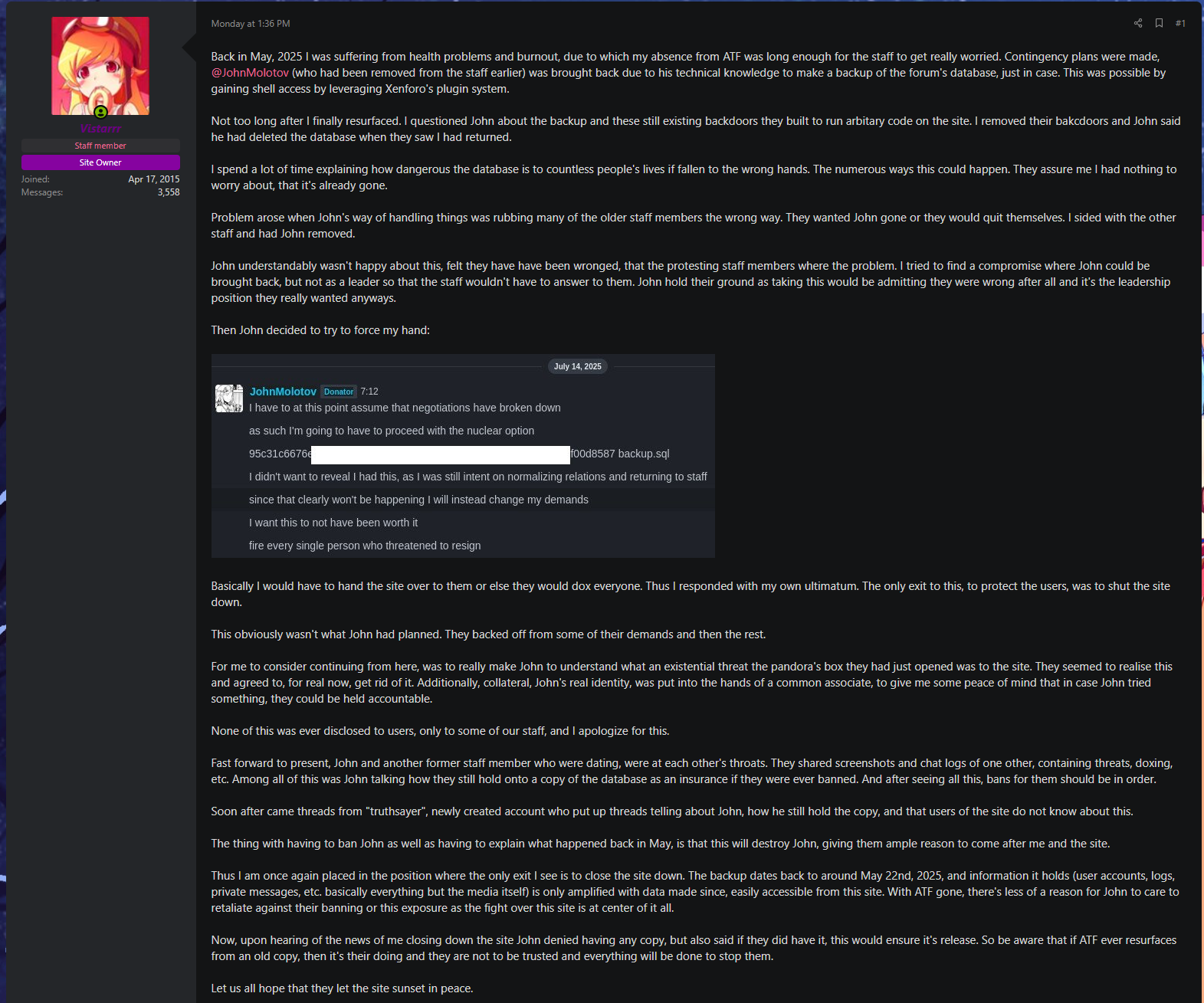 >>558870601>"let me be a mod again">they all hate you>"fire them or I'm releasing my backup of the site">admin threatens to shut down the website>"okay im sorry I deleted it">tell discord tranny boyfriend about still having it>get in fight with tranny boyfriend and he leaks that you still have it>admin: "I don't get paid enough for this shit."