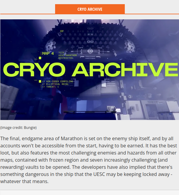 >>558890054>>558890149I don't get it either because Cryo Archive/the Marathon ship is said by gaming websites to "unlock" during season 1, but at the same time it features the most challenging hazards and environments in the game and "7 increasingly challenging vaults waiting to be opened", but it sounds increasingly PvE focused in a game where the playerbase shoots each other on sight. Unless they include a PvE mode specifically for this map, it sounds like an absolute disaster waiting to happen.