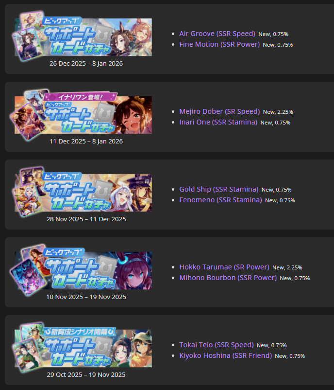 Previous: >>558865423>Global Game NewsLink your account to Cygames iDCurrent Scenario: Aoharu Hai aka "Unity Cup"Current Rate Up Trainee: Mejiro Ardan (3*), Mihono Bourbon (3* alt), Eishin Flash (3* alt)Current Rate Up Support Cards: SSR Agnes Digital (Power), SSR Nishino Flower (Wit), SSR Sakura Bakushin O (Guts), SR Ines Fujin (Wit)Current CM: Aquarius Cup - Tokyo Dirt 1600mMain Story Chapter 5 is out02/18 - 03/01 - Valentine Bourbon & Valentine Flash 3*+Nishino SSR+Bakushin SSR02/18 - 03/01 - The Peak of Confection02/25 - 03/05 - Mejiro Ardan 3*+Agnes Digital SSR02/26 - 03/07 - Legend RacesEarly March - Aquarius Cup - Tokyo Dirt 1600m Left-handed / Winter / Sunny / Firmhttps://umamusume.com/news/100040/https://pages.snep.pw/uma/anni-skill-changes/>JP Game NewsCurrent Rate Up: Almond Eye (3*), SSR Forever Young, SSR Casino DriveNew Scenario "Beyond Dreams" releasedTimeline: https://uma.moe/timelineCygames Webstore: https://webstore.cygames.com/en/umamusume_en/>Thread Clubshttps://rentry.co/umaglobalclublistYou must be E3 (20k points) to join a circle. Apply with /uma/ or /vg/ in your profile or post ID in the thread.>All Guides & Resourceshttps://rentry.org/uma26Game databasehttps://gametora.com/umamusume (Click the gear to switch between JP / global server info)A basic guide for newfagshttps://rentry.org/umaglobalFind networks if your region is blocked from the game or clienthttps://www.umavpn.top/93Seiyuu & Concertshttps://rentry.org/umstUmamusume Birthday Calendarhttps://ウマ娘.攻略.tools/events/birthdayUma Texthttps://umareader.idsmile.xyz/