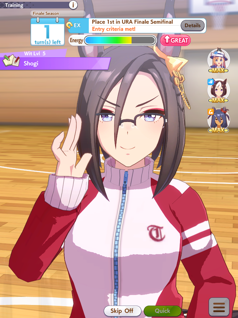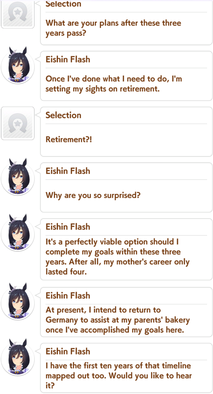 >>558894563Kita's story is hilarious because it's the exact inverse of Teio's. She's still consistently winning G1s, but because she can't win exactly the way she wants and her lungs are a little creaky, she just says "guess I'm washed, time for retirement." It's comically pessimistic.