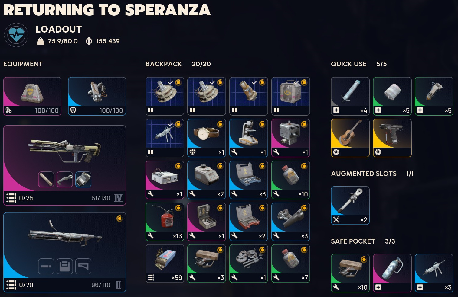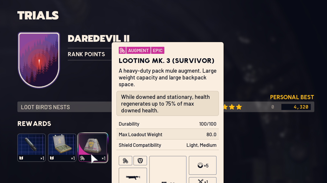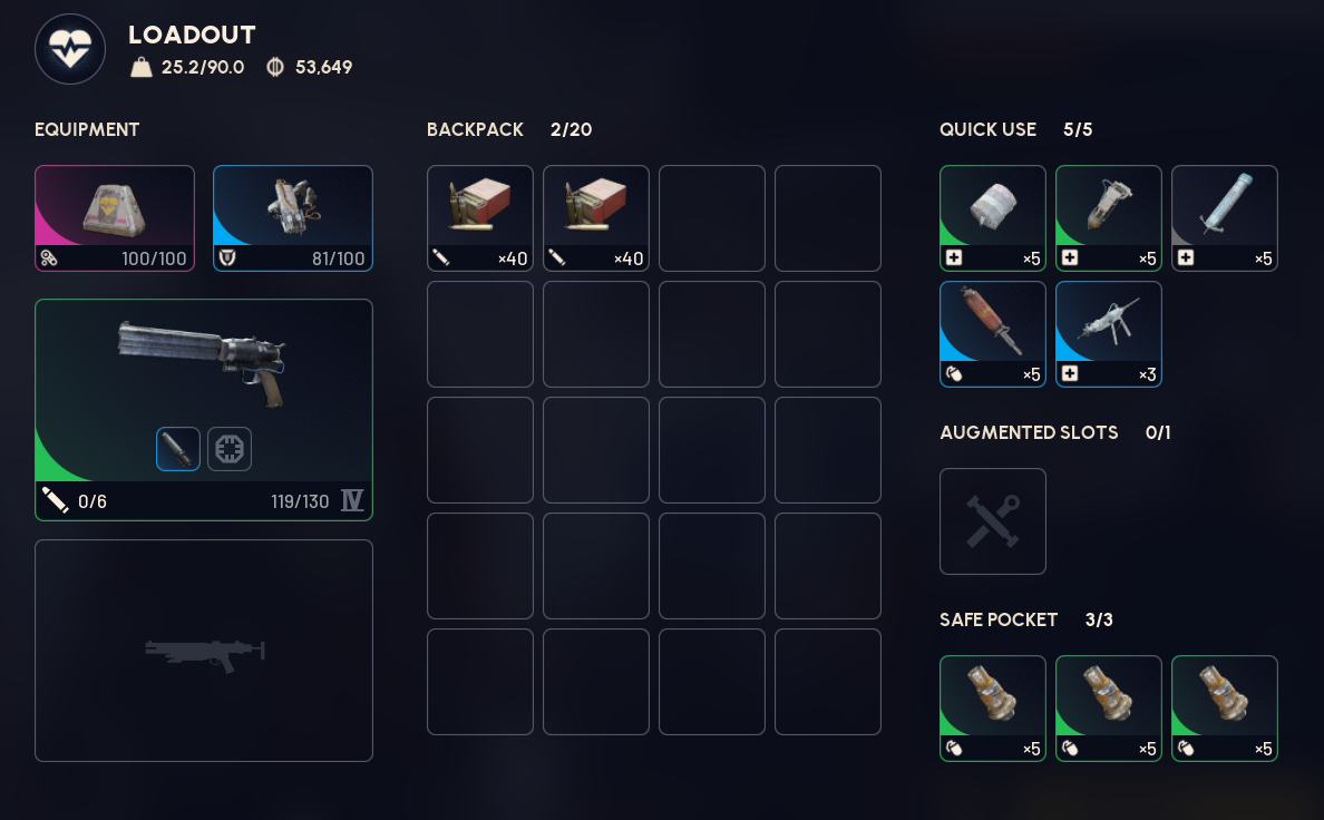 >>558914626Anvil only primary is the best looter loadout since it keeps you light incase you find weapons+mods. I do a pretty similar setup but feel safer with:>loot mk 2 for cost effectiveness>3 bandage, 3 shield incase I die (stretches a day's worth of mulien from Celeste into 3+ matches if I fuck up)>wolfpack or smokes>raider hatch key