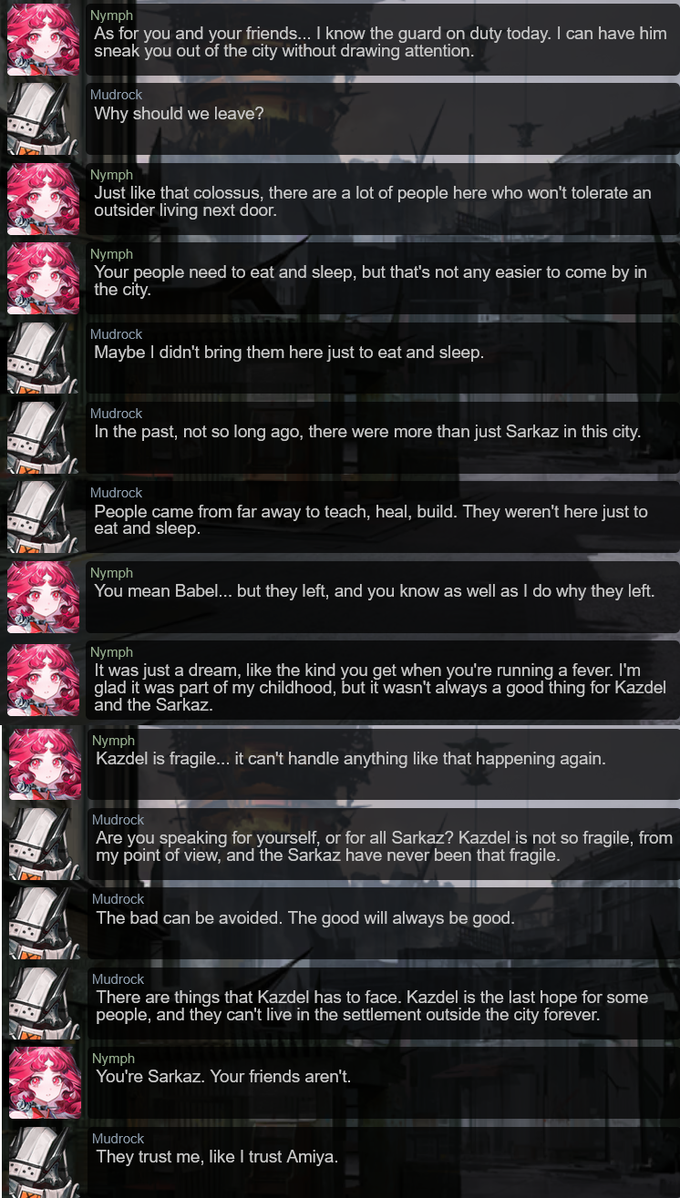 Nyes at least Mudrock is based. A true red blooded Sarkaz but still giving enough damn to save infected goys.