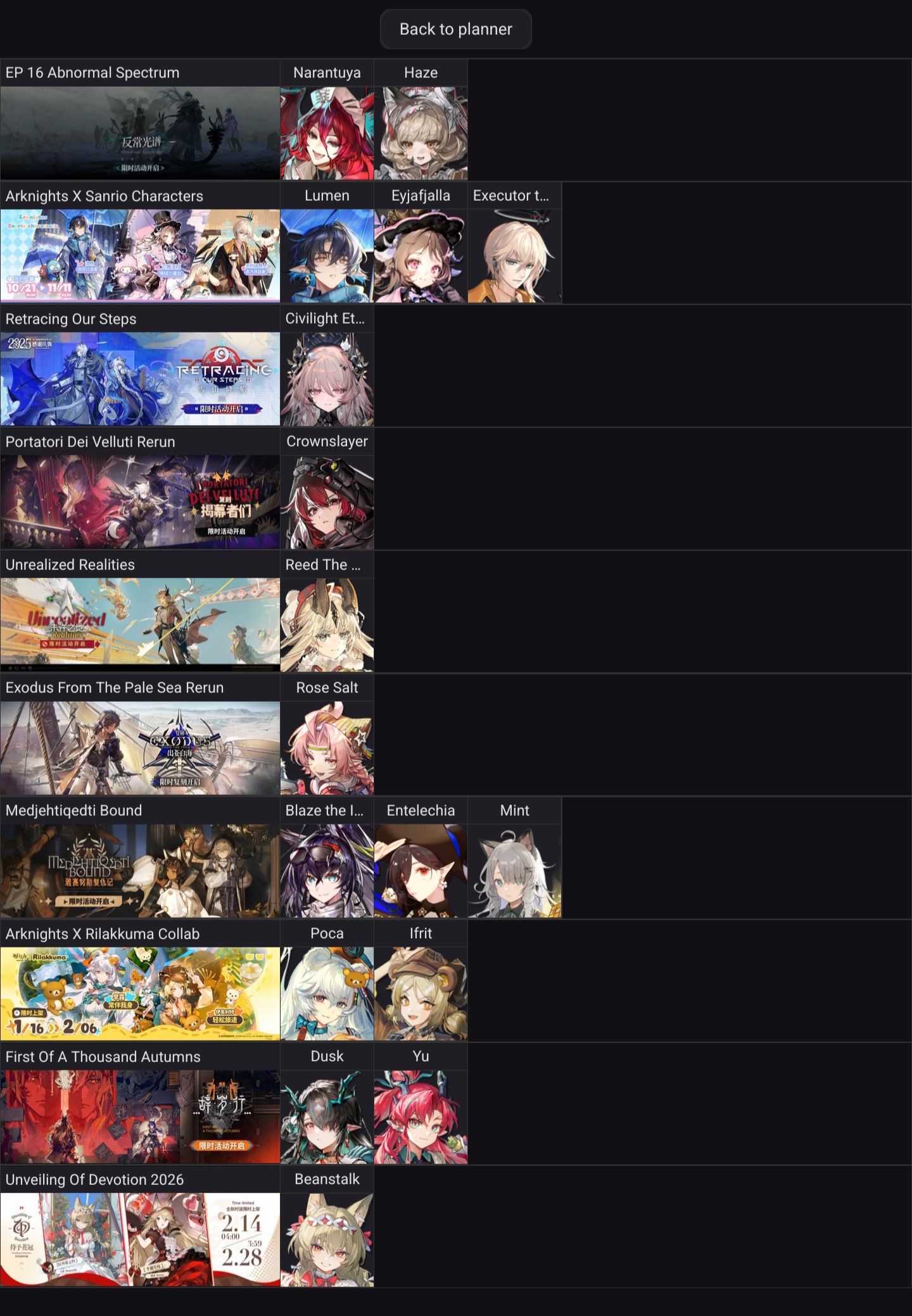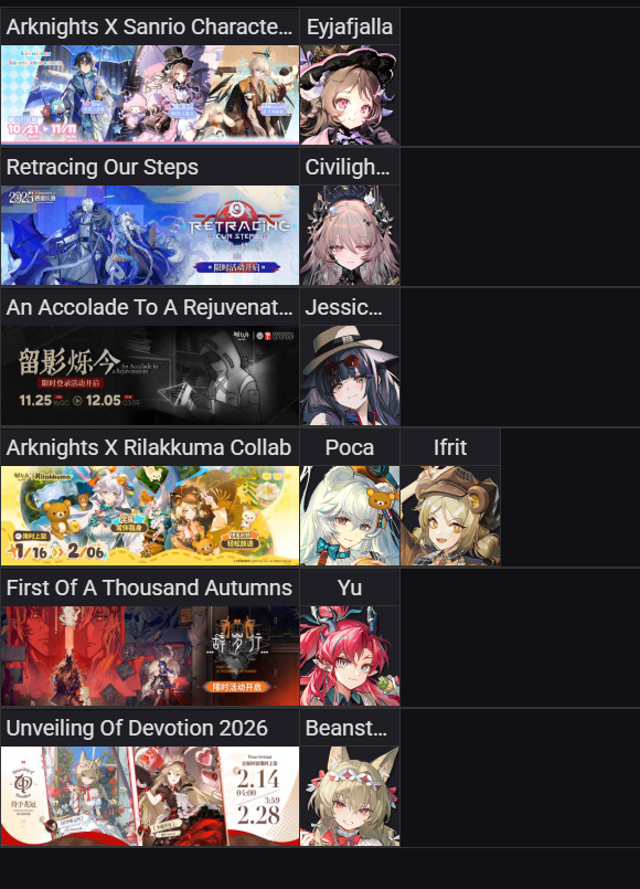 Previous thread:>>558849774>CURRENT, FUTURE GLOBAL/JP/KR CONTENT:[2/27-3/13][Standard]6* Sniper Fiammetta, 6* Defender Penance (Shop), 5* Vanguard Cantabile, 5* Caster Harmonie (Shop), 5* Specialist Spuria[2/23-3/10][Kernel]6* Caster Ceobe (Shop), 6* Specialist Weedy, 5* Vanguard Reed (Shop), 5* Guard Franka, 5* Supporter Sora[2/10-3/3][Crossover]Sakiko Togawa, Uika Misumi, Mutsumi Wakaba, Nyamu Yuutenji, Umiri Yahata[2/14-2/28][0011/Yun]Shamare[2/24-3/6]Ending a Grand Overture Rerun[2/24-3/10][Rhodes Kitchen]Bobbing>CURRENT, FUTURE CN CONTENT:[2/12-2/26][Standard]6* Sniper Fiammetta, 6* Caster Ho'olheyak (Shop), 5* Specialist Wulfenite, 5* Specialist Figurino, 5* Supporter Windflit (Shop)[2/3-3/3]Reselling a bunch of skins[2/10-3/3]First of A Thousand Autumns - 5* Sniper Ju[2/10-2/24][Ashes to Ashes, Ages on Ages]6* Specialist Wang, 6* Guard Ch'en the Dawnstreak, 5* Medic Taraxacum[2/10-3/10][0011]Dusk, Ling, Yu, Philae, Surfer[2/14-2/28][Unveiling of Devotion]Breeze, Beanstalk[2/14-2/28][Unveiling of Devotion Re-Edition]Nightmare, Hibiscus the Purifier; Harmonie, Arene[2/24-3/17][Epoque]Greyy>/akg/ website:akgcc.github.io>AK EN Database:puppiizsunniiz.github.io/AN-EN-Tags/akhrchars.html>More valuable resources:rentry.org/akg_resources>/akg/ merch guiderentry.co/akg_merch