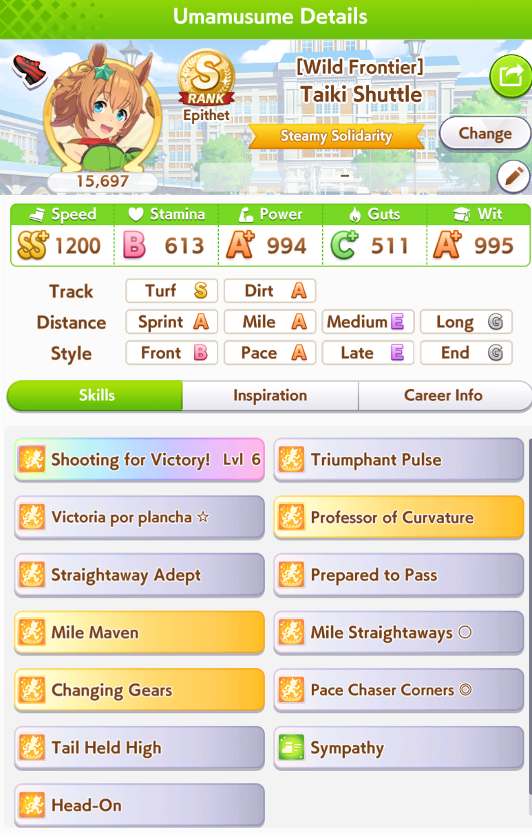My Dirt options are looking to be Smart Falcon, Taiki Shuttle/El Condor Pasa, and NYUrara. Will this work? What should I even give Taiki for skills? I'm seriously clueless