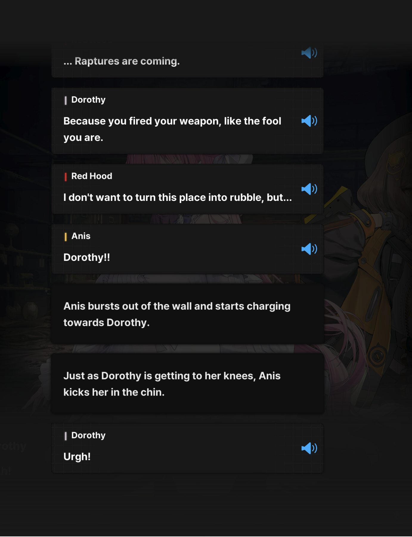 I just read though Wordless.Honestly I thought it was really good, easily on par with Second Affection and even if I don't particularly like Yuni or Mihara I think the story told with them was compelling. It's also fairly understated but I really do think Nikke is at its best when its dipping its toes into light horror elements and Yuni's fate in Wordless is the type of body horror I think Nikke does really well. Also as an aside they mention that the culprits behind the Ark Invasion were leaked and that Missilis suffered because of it, which I appreciate, the whole "Nikke-kind actually just strictly benefited from the deaths of tens of thousands of humans" thing was always struck me as a really shitty writing choice.Hopefully the main story doesn't fuck up the ending of this side story, because I have a strange feeling Wardress is going to be shoved back in the main story eventually and for the worse.