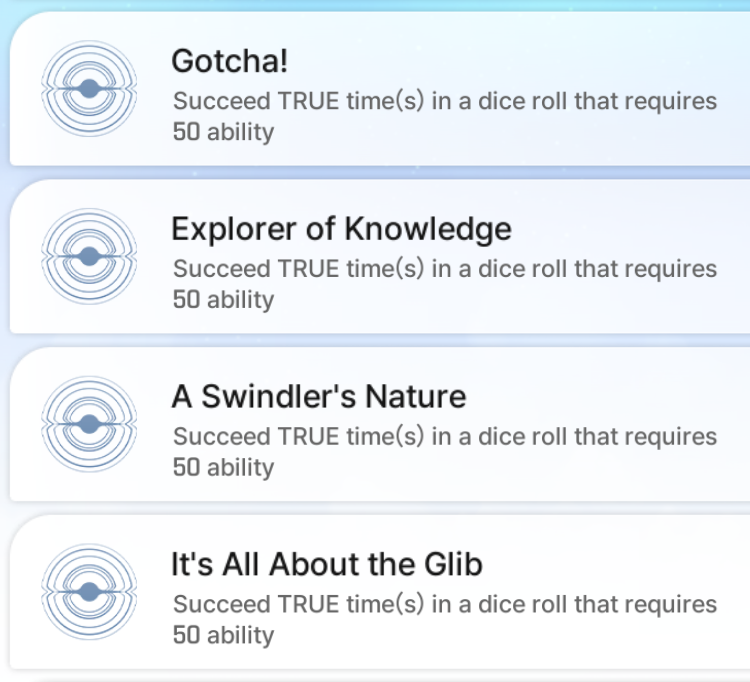 >>558921619TRUE is the number of times you need to succeed I think, but it's being interpreted as a boolean instead of an integer.Not sure about 50 ability, maybe <50% chance of succeeding? Crazy that they haven't fixed this yet.