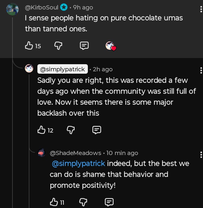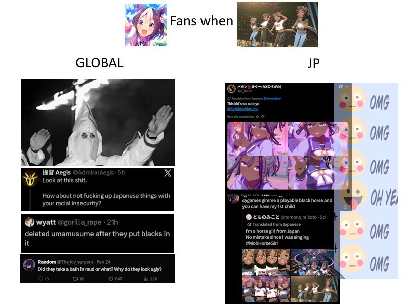 >>558919827>Now more than ever we need more representation!I never really understood this thirst of representation and validation in fictional works. If they're so hungry to be represented, maybe they should make their own franchise and mold the characters in their own image?>I'm not even into uma like that.Maybe a slippery slope way of thinking but I hope they won't start using the franchise as a means to fuel their self-serving agenda like what has happened to western gaming culture these days.