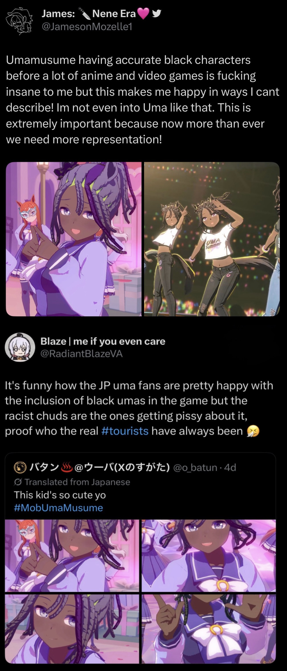 >>558918550>>558919053Honestly the black Uma girls are cute. Usually people make them ugly on purpose and pretend they’re “beautiful”, but cygames made them pretty erotic, I’d plap them. The only issue with adding black characters though is that it always invites people who don’t even play the game to start to retarted discourse. My entire Twitter timeline has been filled with aids like this for the past few days. I just want to see illustrations of cute Uma’s being cute, and cute Uma’s being plapped and bred man…