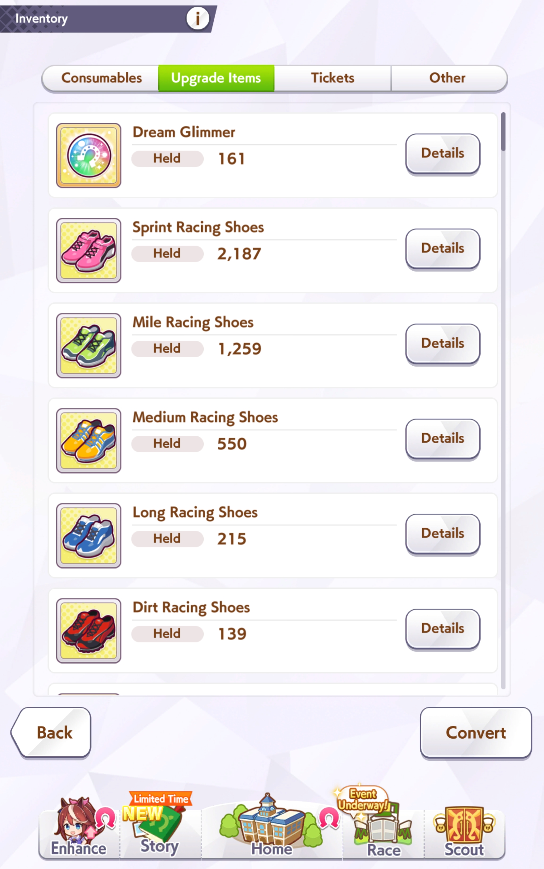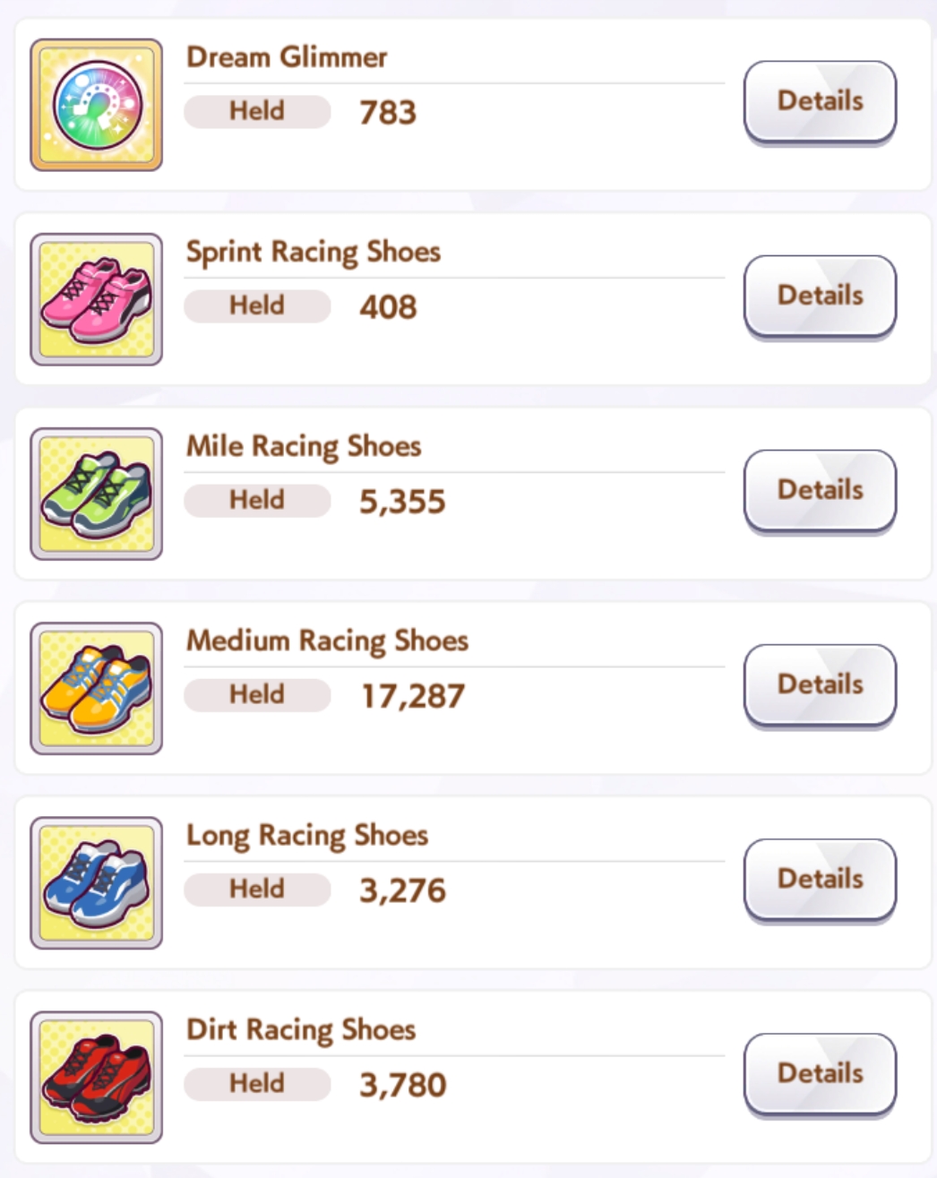 >>558919443>>558919535I didn't know which ones to send so I started with Sprint and worked my way to the right. Day 1 I sent Sprint x3 and got x6 and x10 x10. Dirt for me x0 all 3 times. Everyone is asking for Dirt Shoes constantly and are always running out of time at 0 or x2 (from me donating) and now I have >100 Dirts and 2500+ Sprints in stock.