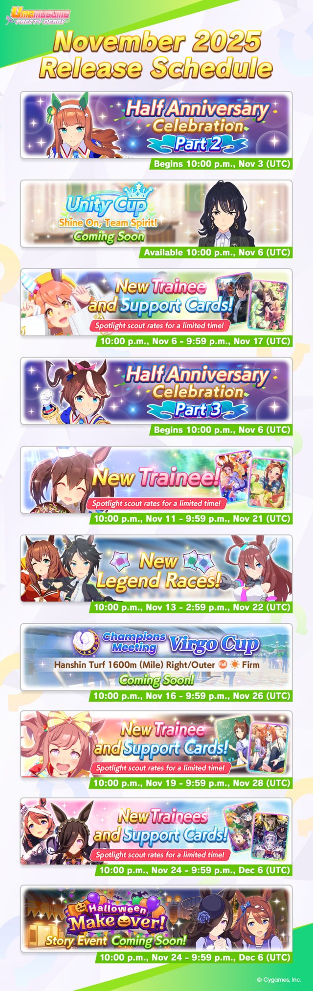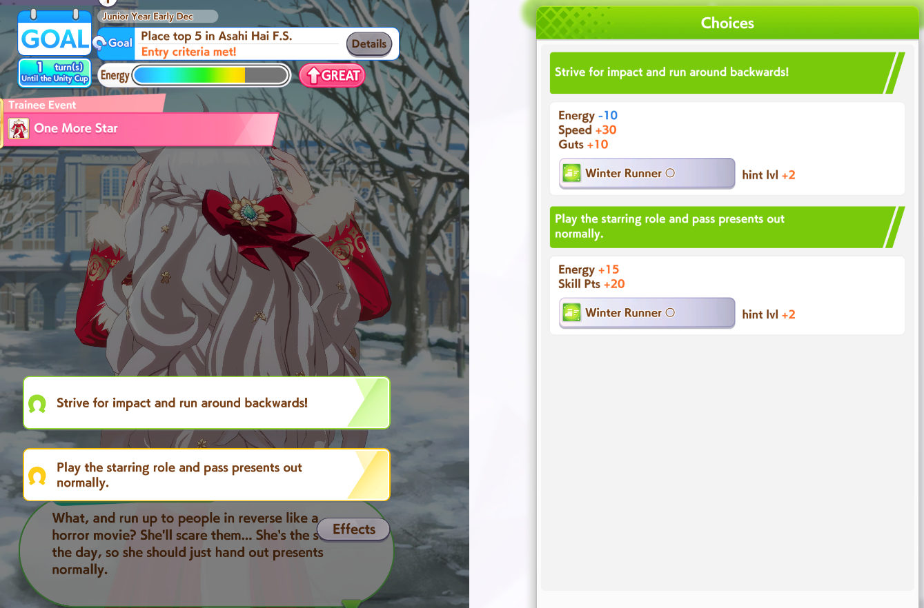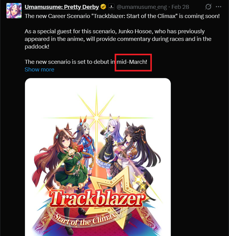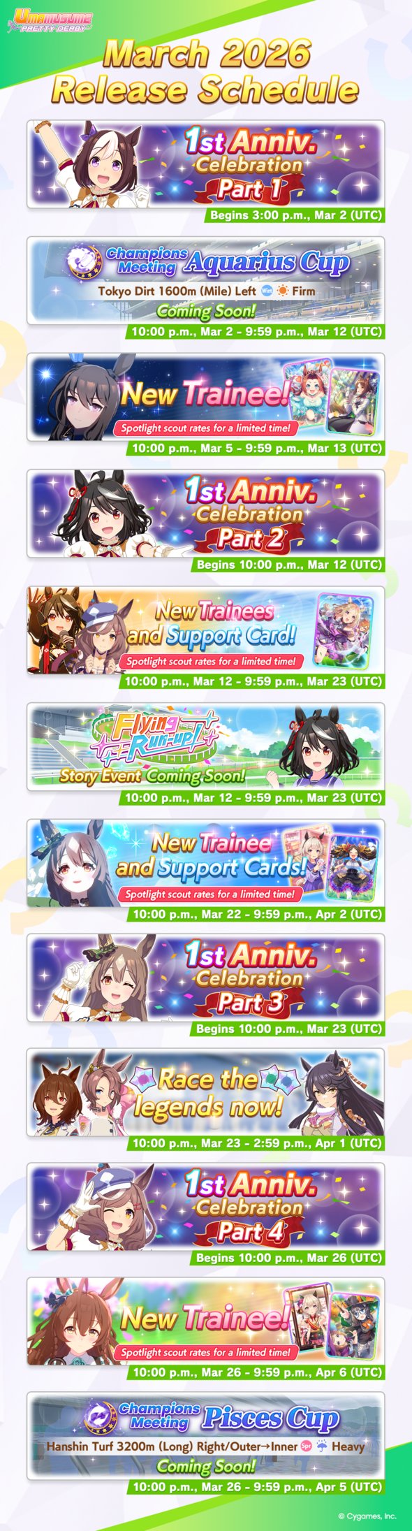 Previous: >>558895974>Global Game NewsLink your account to Cygames iDCurrent Scenario: Aoharu Hai aka "Unity Cup"Current Rate Up Trainee: Mejiro Ardan (3*), Mihono Bourbon (3* alt), Eishin Flash (3* alt)Current Rate Up Support Cards: SSR Agnes Digital (Power), SSR Nishino Flower (Wit), SSR Sakura Bakushin O (Guts), SR Ines Fujin (Wit)Current CM: Aquarius Cup - Tokyo Dirt 1600mMain Story Chapter 5 is out02/18 - 03/01 - Valentine Bourbon & Valentine Flash 3*+Nishino SSR+Bakushin SSR02/18 - 03/01 - The Peak of Confection02/25 - 03/05 - Mejiro Ardan 3*+Agnes Digital SSR02/26 - 03/07 - Legend RacesEarly March - Aquarius Cup - Tokyo Dirt 1600m Left-handed / Winter / Sunny / Firmhttps://umamusume.com/news/100040/https://pages.snep.pw/uma/anni-skill-changes/>JP Game NewsCurrent Rate Up: Almond Eye (3*), SSR Forever Young, SSR Casino DriveNew Scenario "Beyond Dreams" releasedTimeline: https://uma.moe/timelineCygames Webstore: https://webstore.cygames.com/en/umamusume_en/>Thread Clubshttps://rentry.co/umaglobalclublistYou must be E3 (20k points) to join a circle. Apply with /uma/ or /vg/ in your profile or post ID in the thread.>All Guides & Resourceshttps://rentry.org/uma26Game databasehttps://gametora.com/umamusume (Click the gear to switch between JP / global server info)A basic guide for newfagshttps://rentry.org/umaglobalFind networks if your region is blocked from the game or clienthttps://www.umavpn.top/93Seiyuu & Concertshttps://rentry.org/umstUmamusume Birthday Calendarhttps://ウマ娘.攻略.tools/events/birthdayUma Texthttps://umareader.idsmile.xyz/