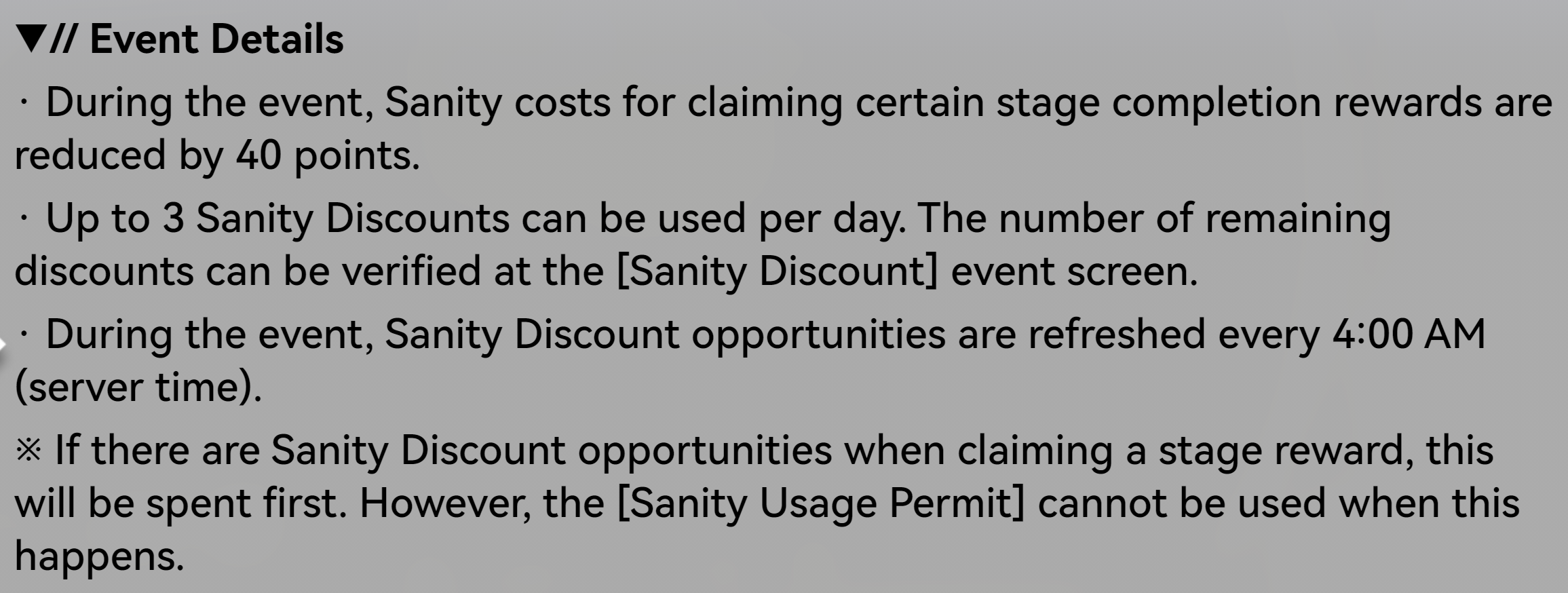 >>558942079>reduced by 40 points>3 discounts per dayso its just an extra 120 sanity a day? thats not much of an 'event'