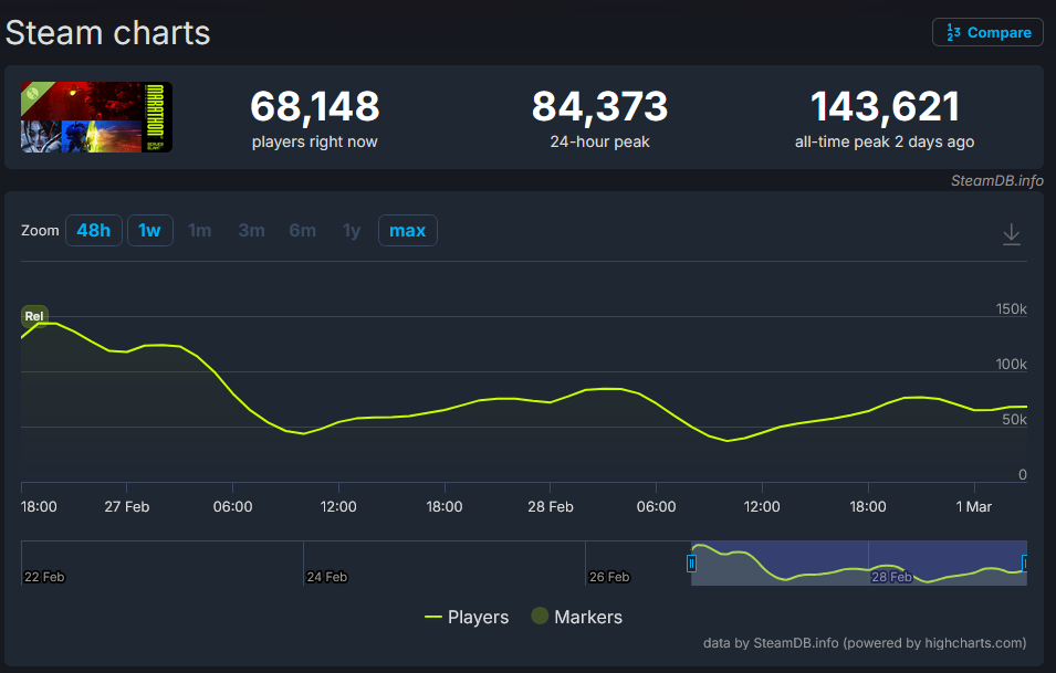 >>558939582yea thats basically how its going to be, i expect a playerbase of 50-100k similar to tarkov, with big boosts during new seasons, and i'd be perfectly happy with that