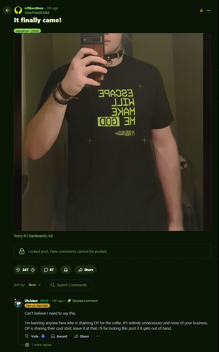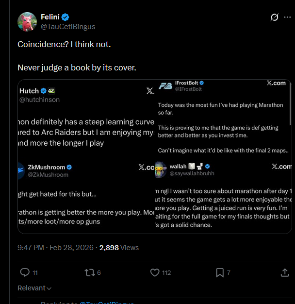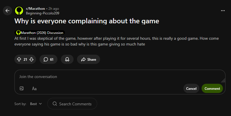>>558966457>there is literally ZERO reason to play this game at allnot that anon, but you underestimate the amout of people that will fall for this sort of grindy, masochistic autism. There seems to be a decent progression system baked in that we haven't really uncovered yet, I'm not saying it will be good but people will play it.>>558966581>Marathon is the most astroturfed game sincePeople say this every AAA launch, but honestly most people are just shitting on this game. The only "astroturfing" i've seen is on the hugbox subreddit and from grifters on twitter. /v/ is just ironic "having a blast" shitposting.