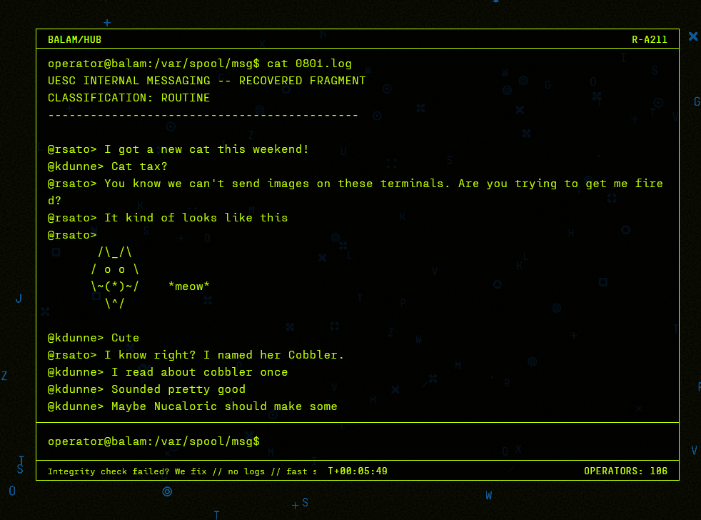 The loop is really tiring when it’s some weird ass AI jpeg talking to you as a narrative reward for beating missions. The analogy is like, coming home after a 10 hour shift and someone rings your doorbell trying to tell you about Jehova. I don’t want to learn about Tau Ceti or anything after attempting a quest 5 runs in a row with brutal PvP and tense atmosphere.